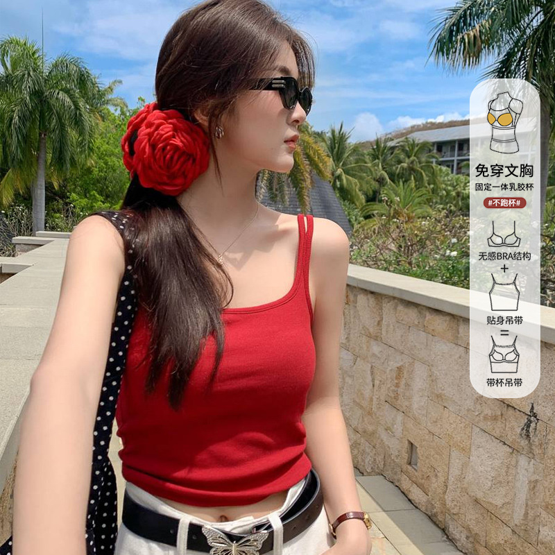 小背心女内搭夏季新款外穿美背带胸垫一体吊带红色打底短款上衣