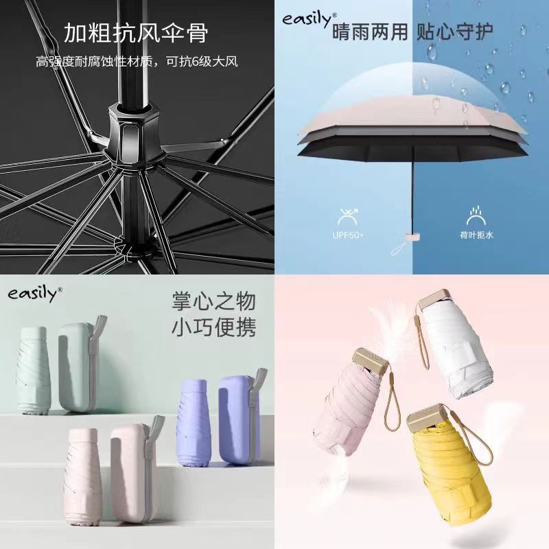 手动口袋扁迷你小巧可爱纯色黑胶防晒六折防紫外线便携晴雨两用伞