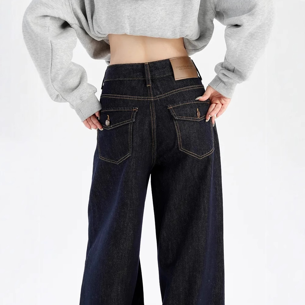 美式深蓝不掉色阔腿牛仔裤女春秋季新款高腰显瘦宽松直筒慵懒垂感
