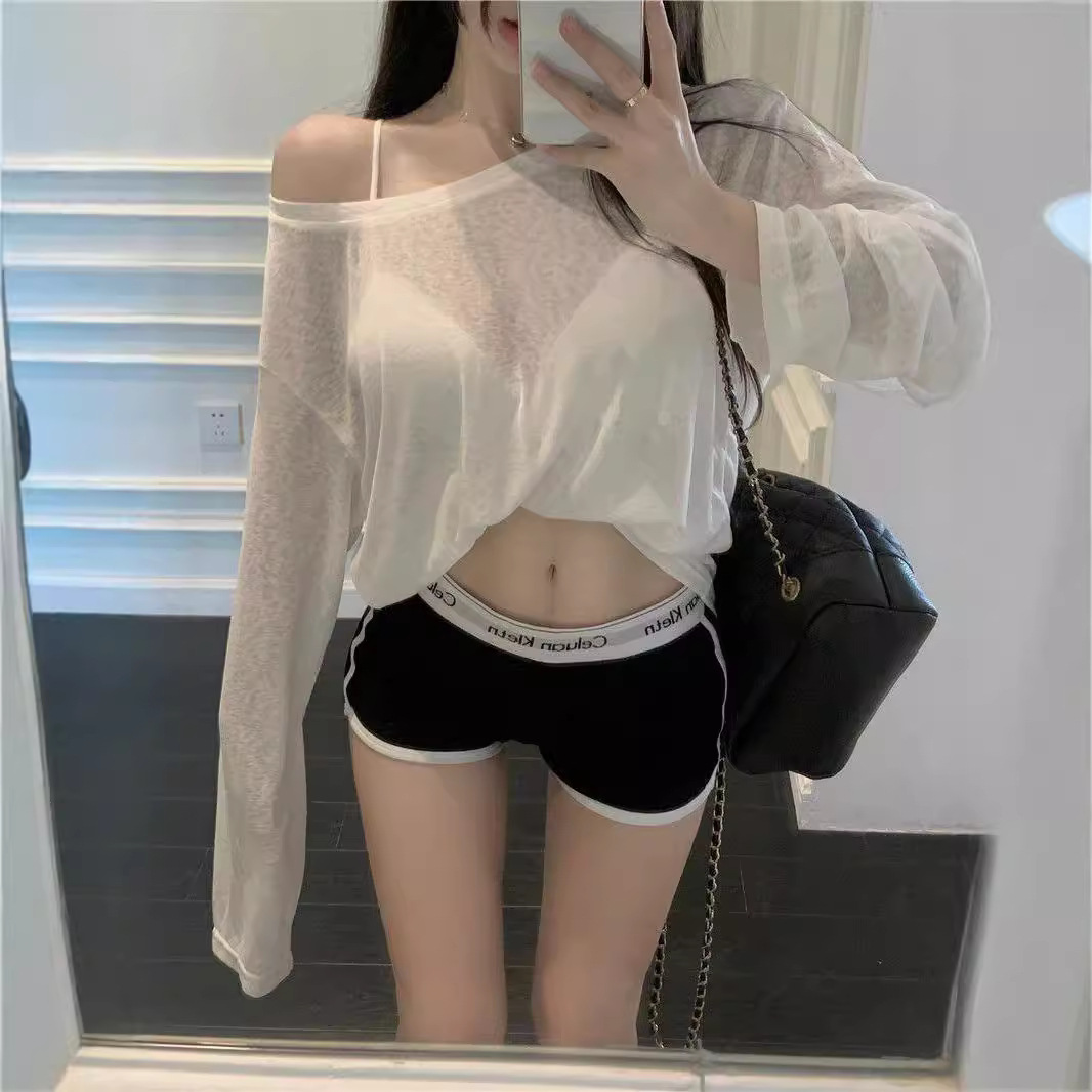 纯欲白色薄款长袖T恤女春装一字肩宽松休闲防晒罩衫外套慵懒上衣