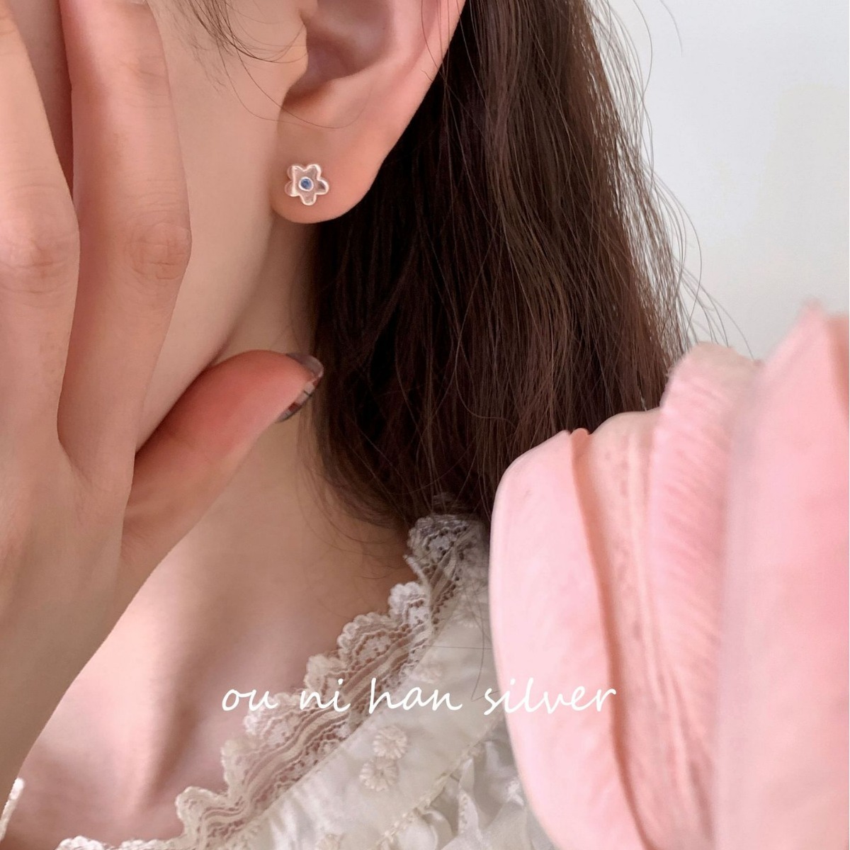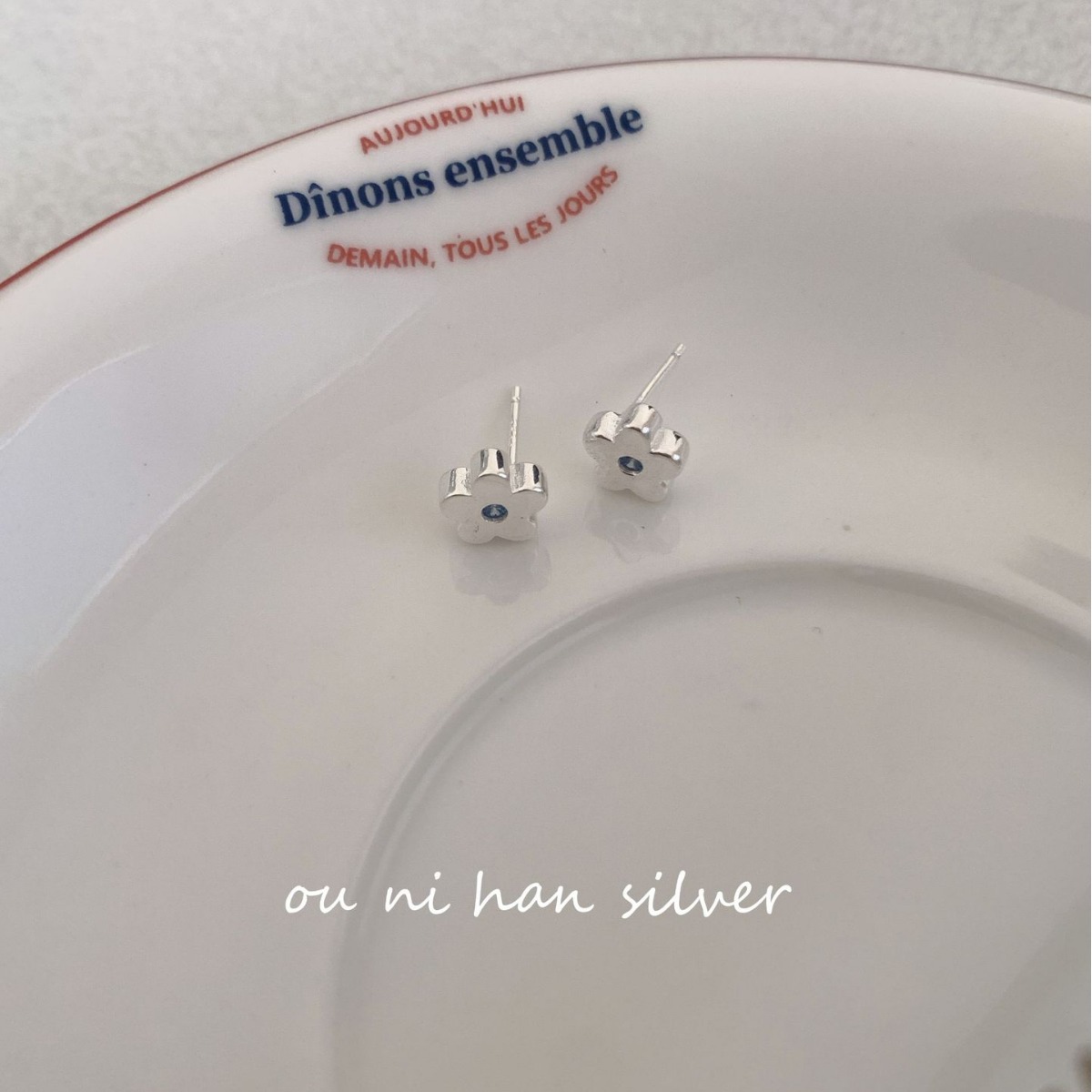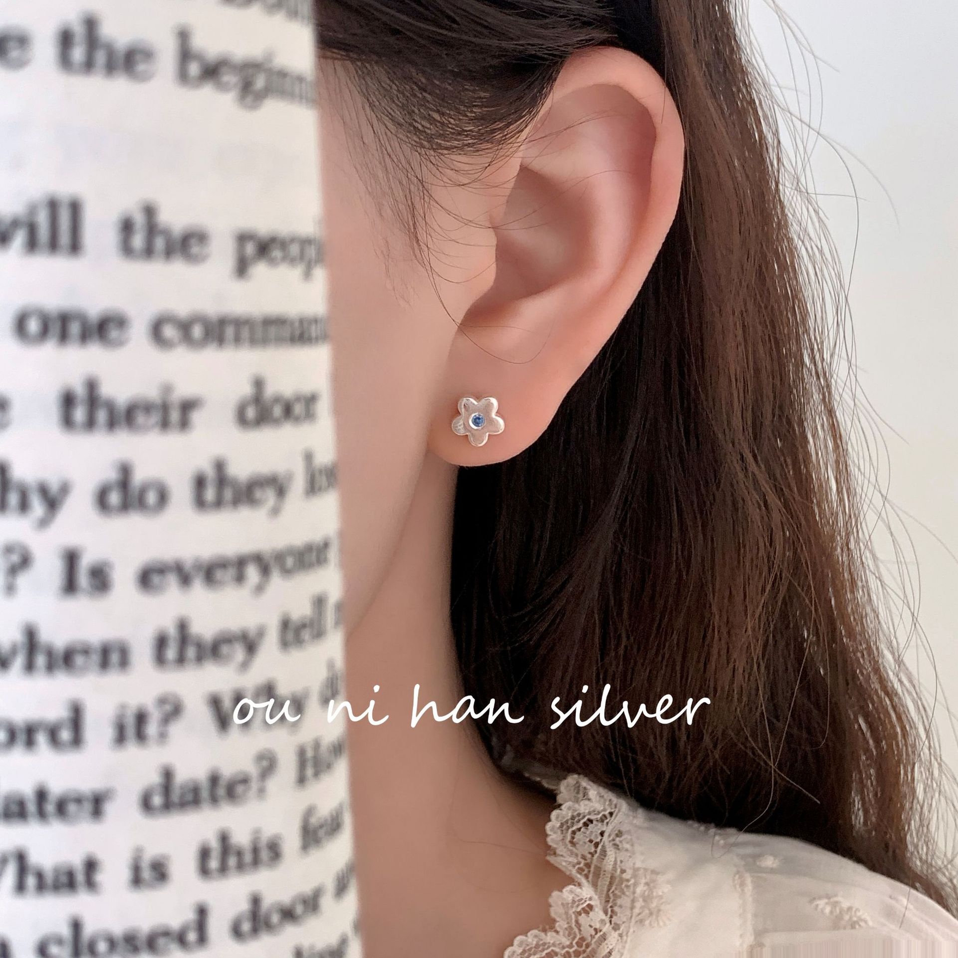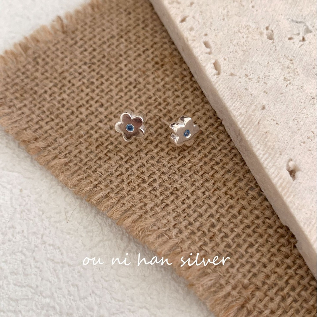 欧尼 简约小众设计百搭耳饰品S925纯银小花朵蓝钻耳钉气质养耳洞