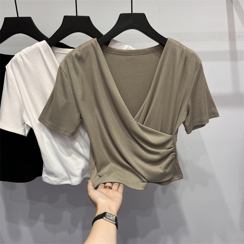 莫代尔夏季气质交叉V领短袖T恤女上衣设计感小众褶皱短款打底衫