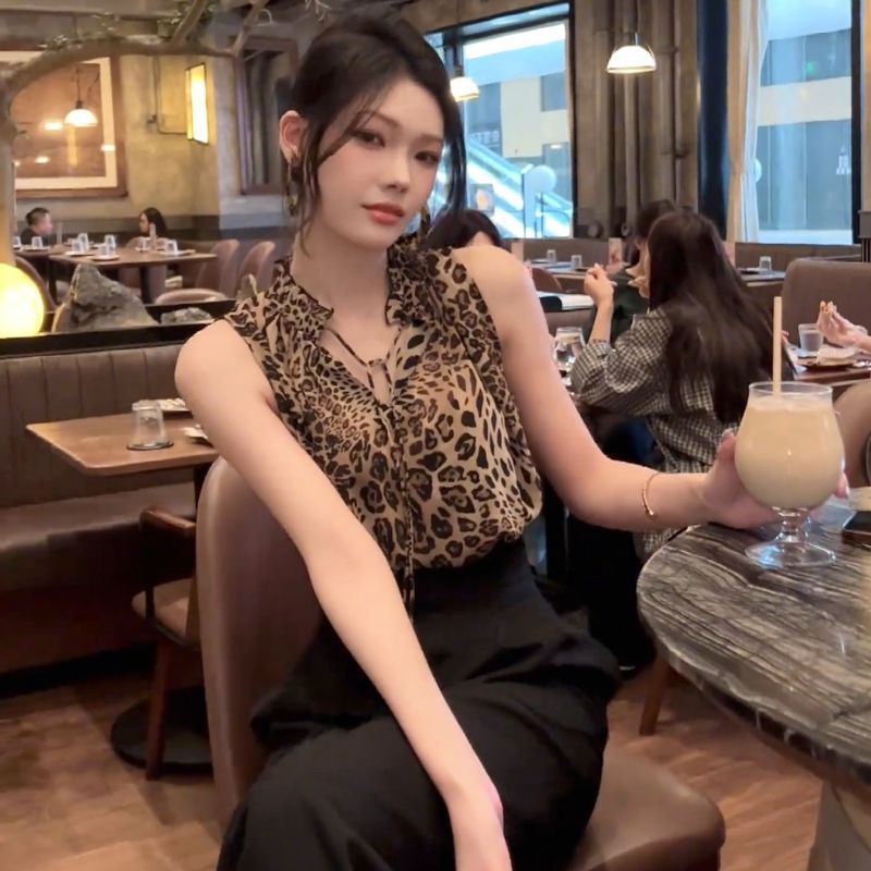 【月销10万】V领豹纹无袖背心女夏季性感辣妹小吊带设计感上衣