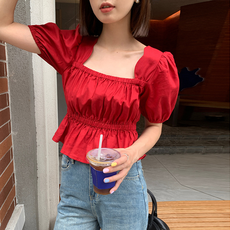 诠释美 NEW OPEN法式方领收腰衬衫女夏季短款百搭小上衣82815