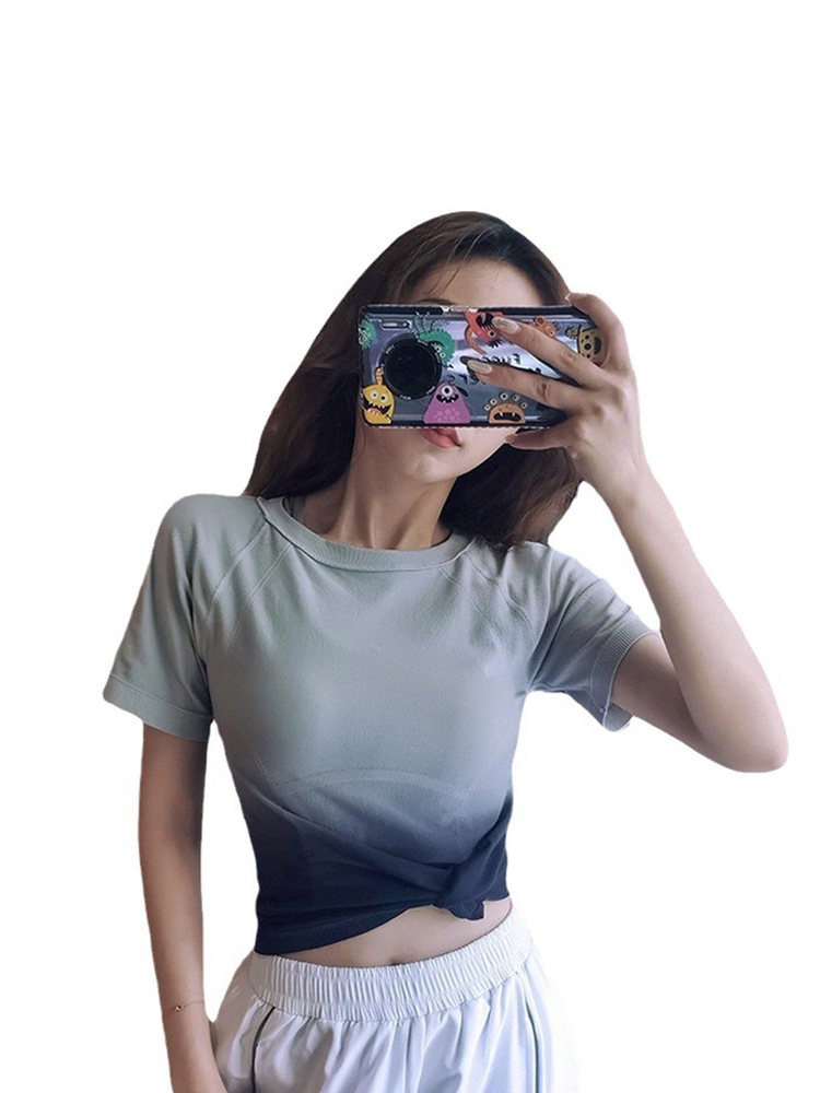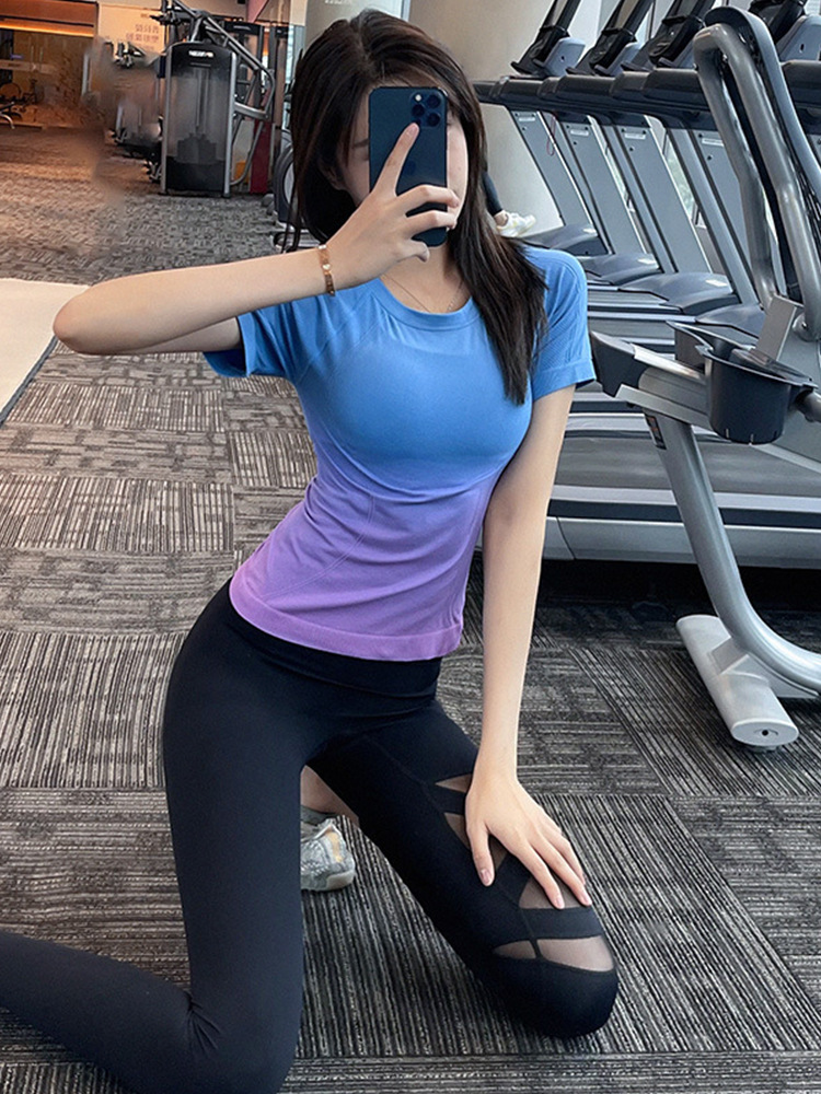 渐变色瑜伽服短袖T恤女款透气健身服短袖健身服上衣不漏背瑜伽服