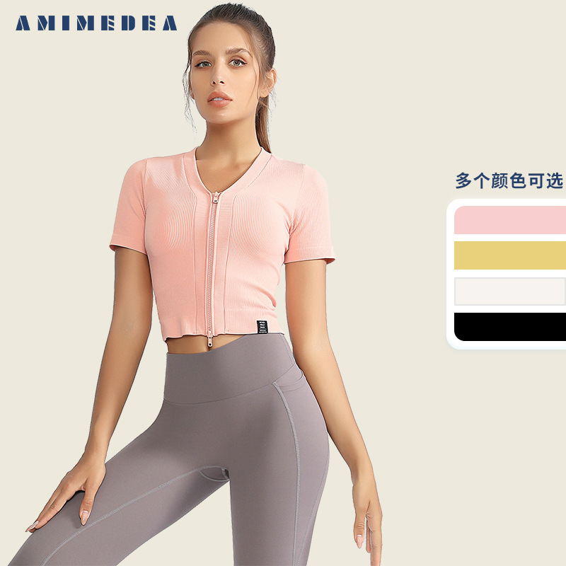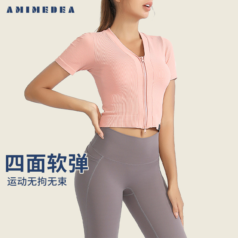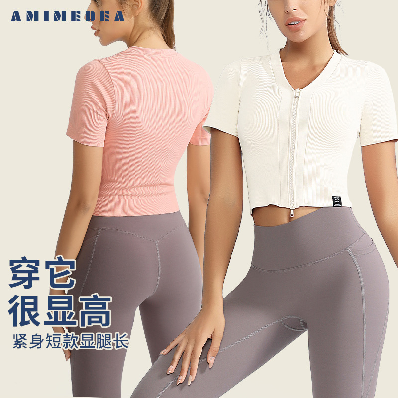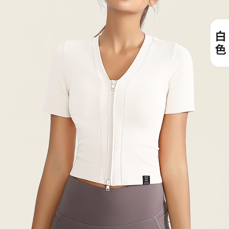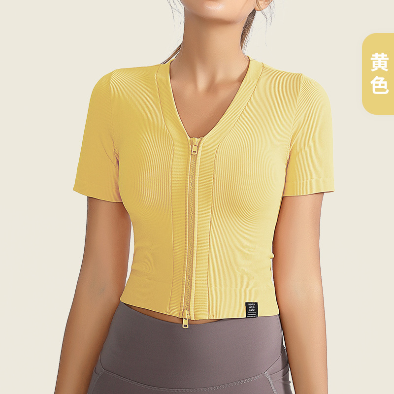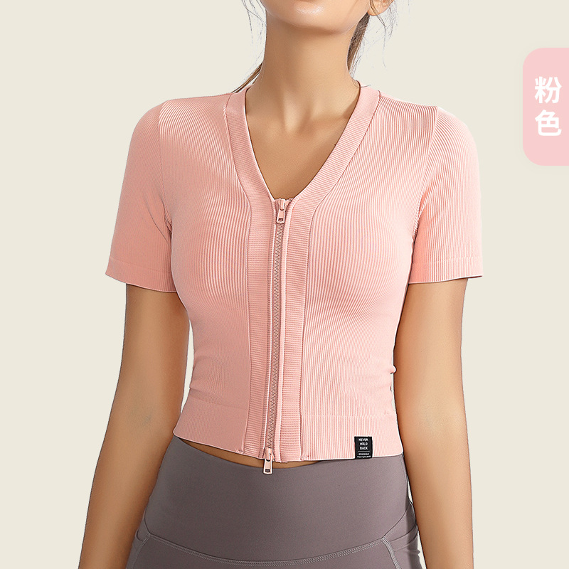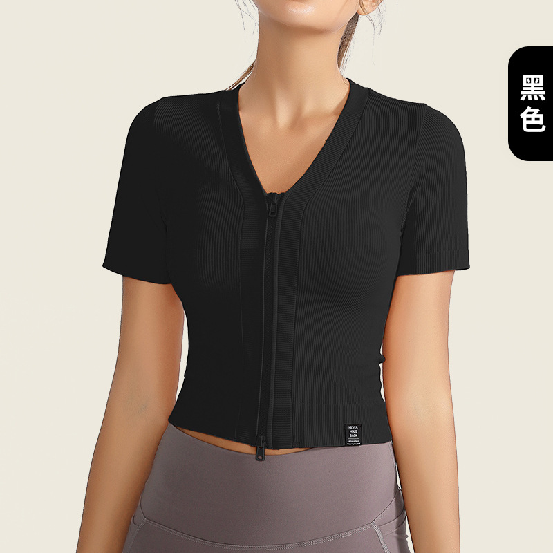 前拉链V领开衫运动短袖女跑步训练健身T恤修身瑜伽服套装女运动