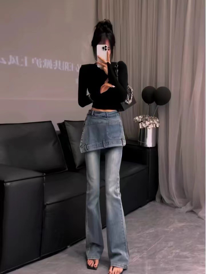 官图 美式复古高街辣妹假两件设计感修身显瘦包臀时髦牛仔微喇裤