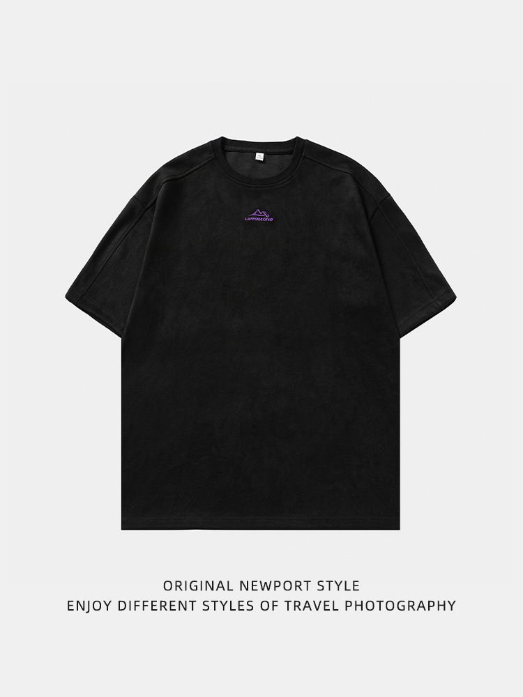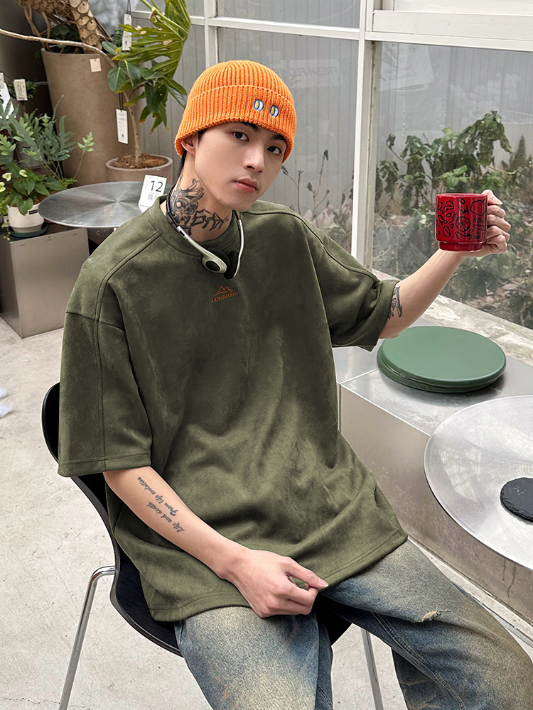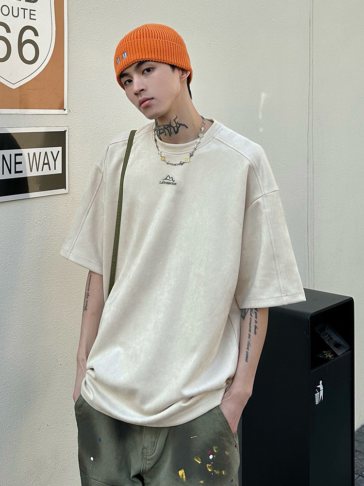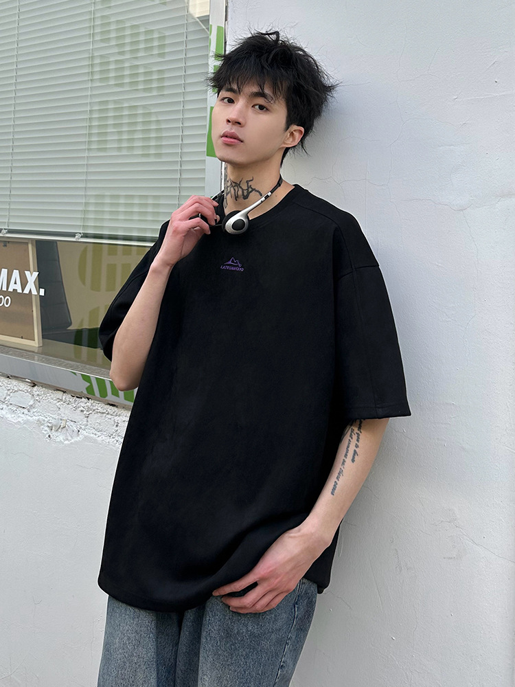 韩路男装 质感麂皮绒短袖T恤男夏季新款潮牌撞色刺绣宽松垂感体恤
