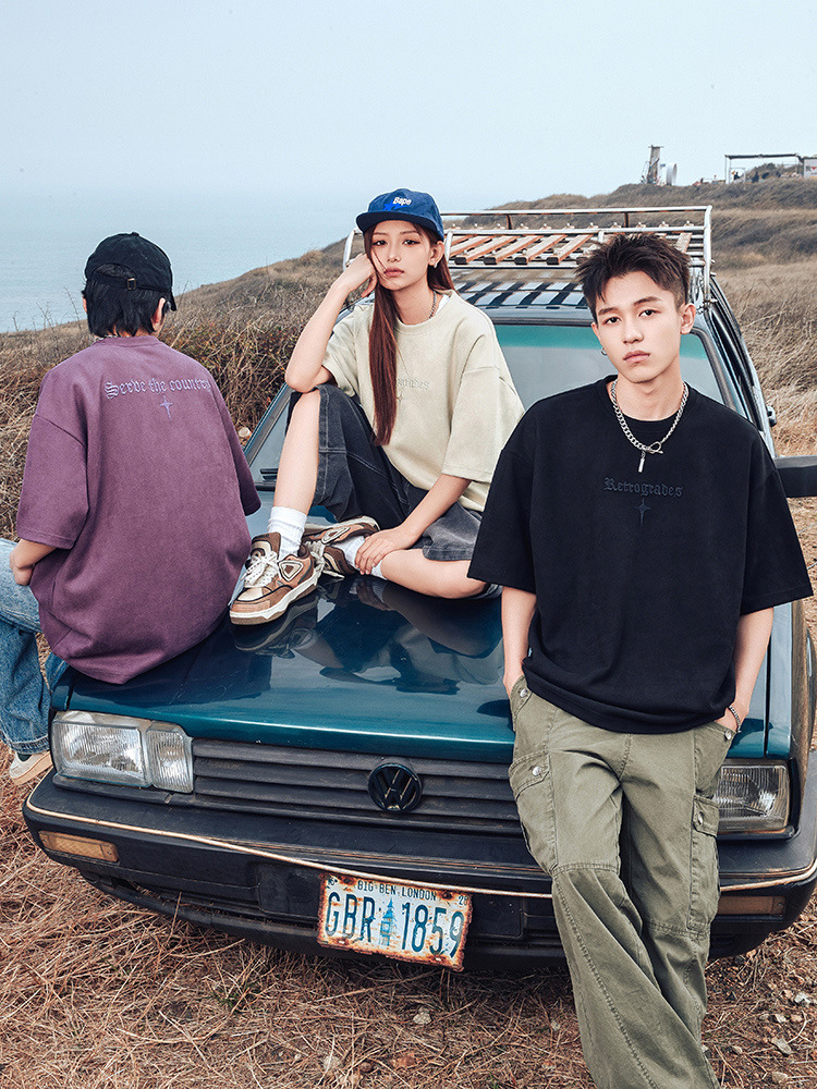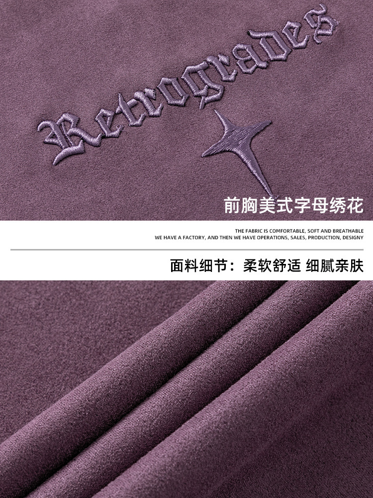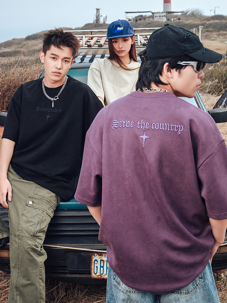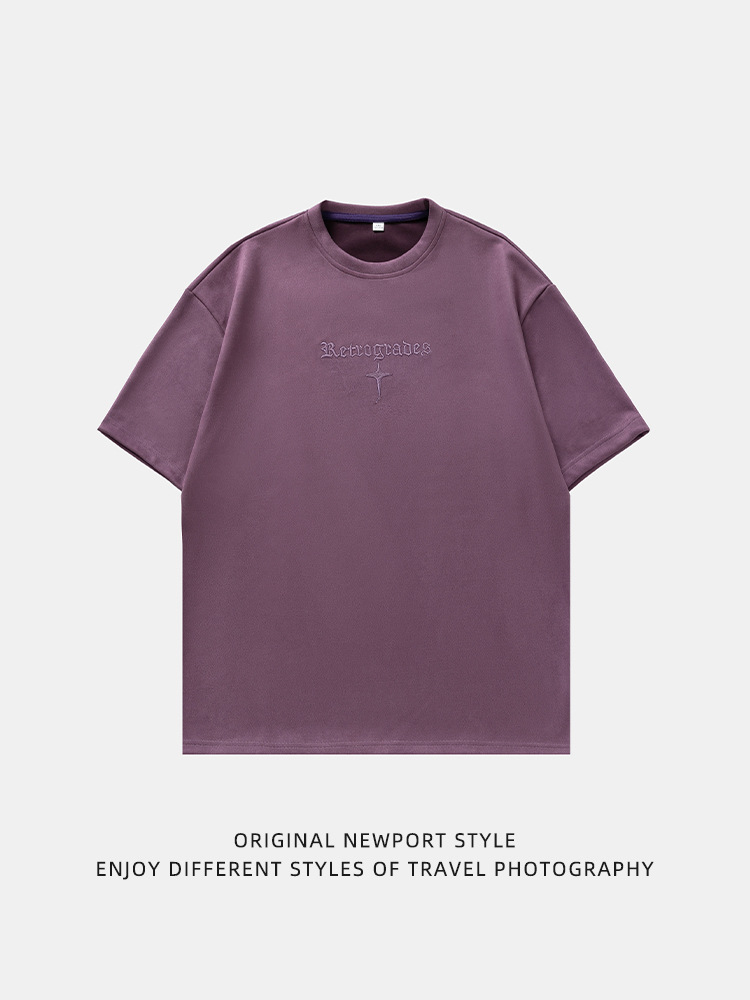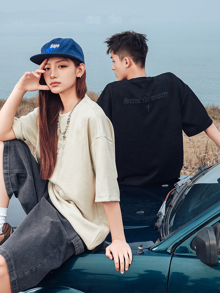韩路男装 质感麂皮绒短袖T恤男夏季潮牌字母绣花高街情侣美式体恤