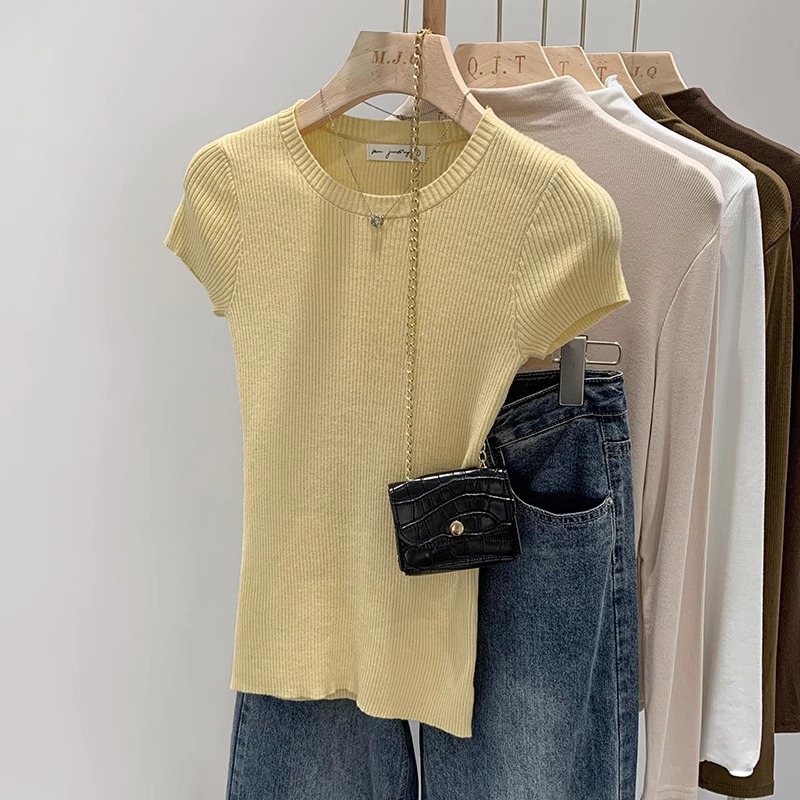 夏季新款多巴胺休闲百搭圆领纯色修身显瘦短袖弹性针织T恤女