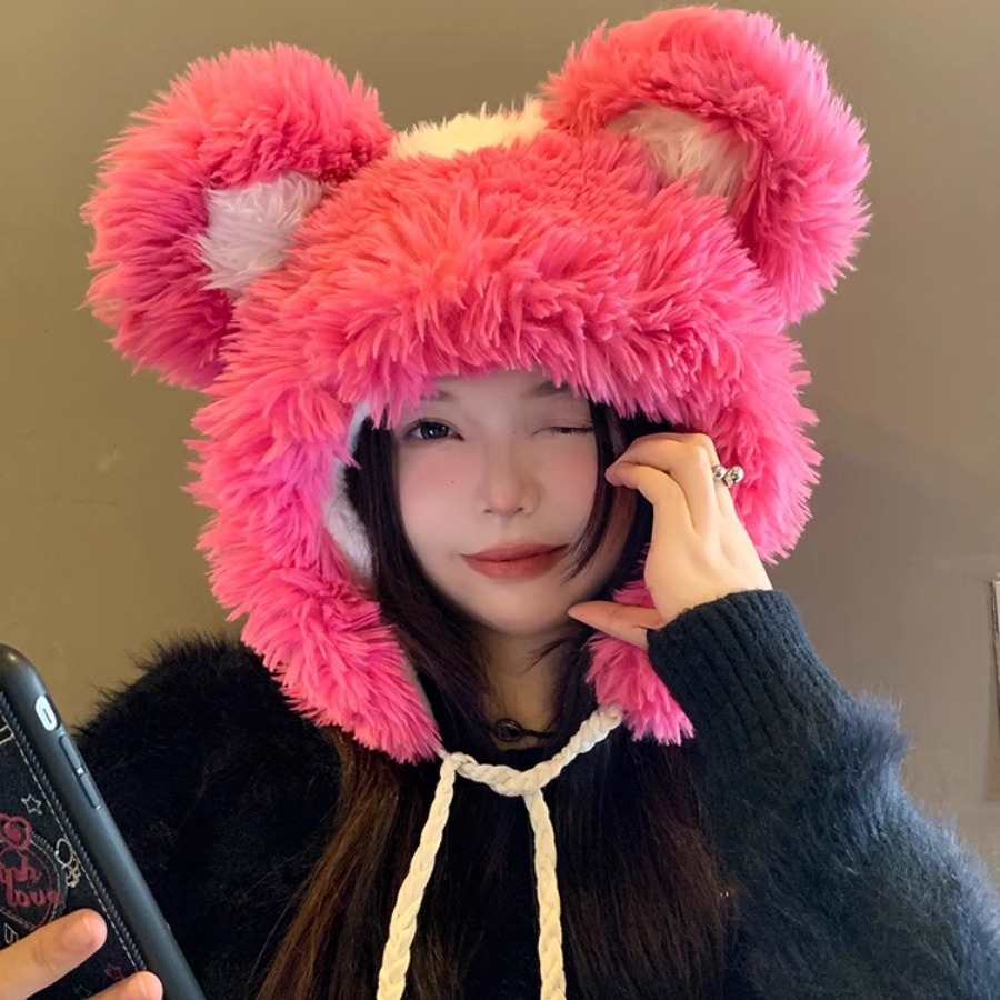 粉色小熊帽子女秋冬季可爱显脸小加厚保暖毛绒帽毛茸茸护耳雷锋帽