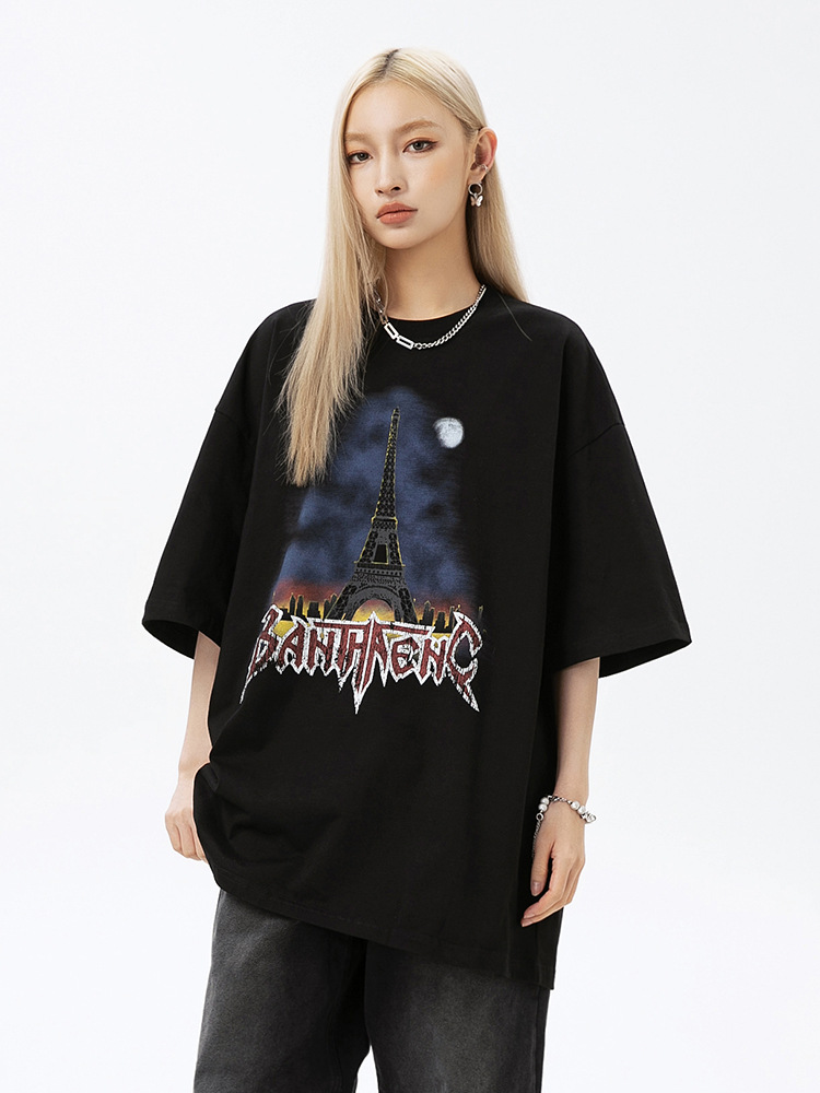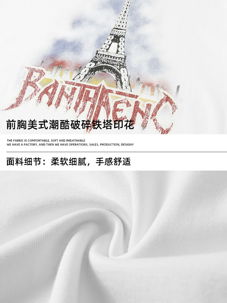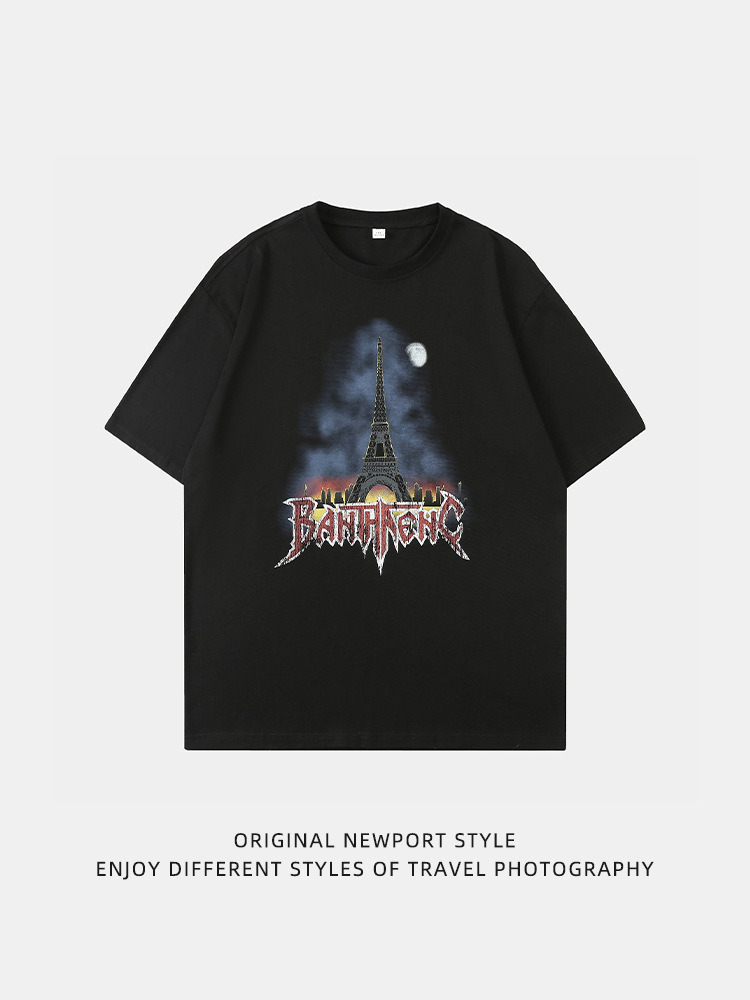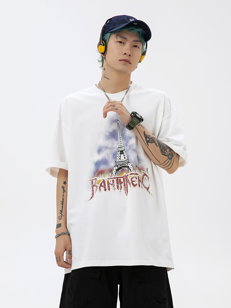 韩路男装 铁塔主题印花设计短袖T恤男女春夏新款美式潮牌纯棉体恤