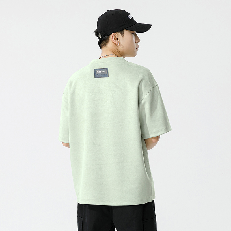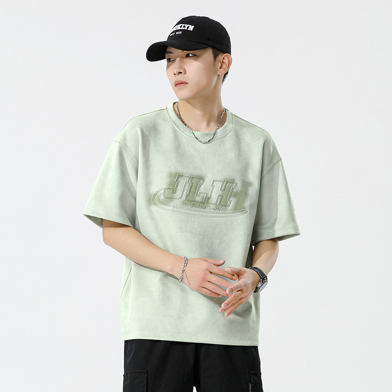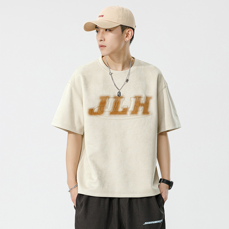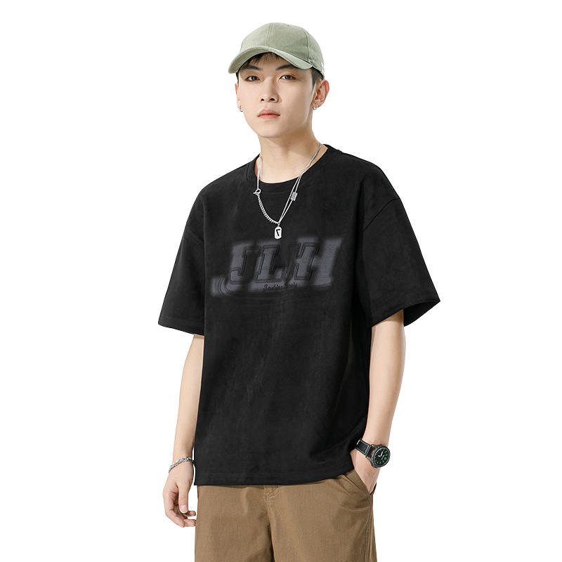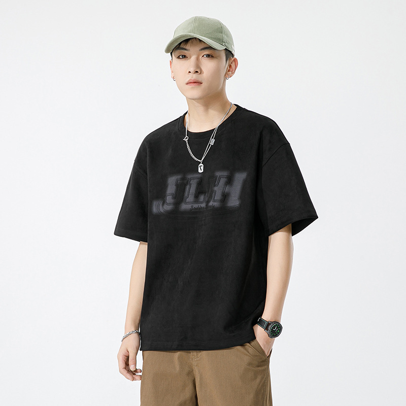 麂皮绒短袖T恤男夏季新款美式复古压花宽松体恤圆领半袖打底