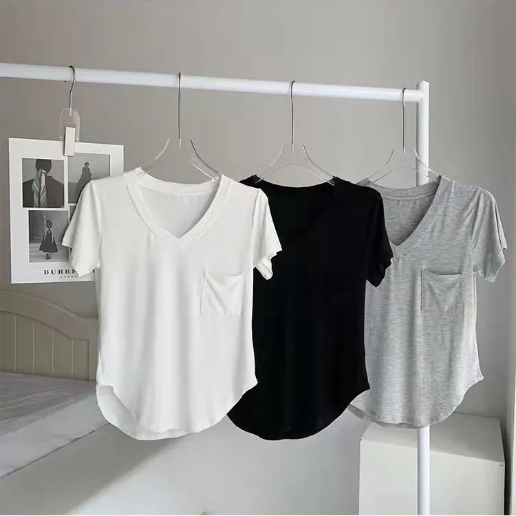 夏季纯色V领莫代尔棉短袖口袋纯欲风垂坠感锁骨宽松t恤女