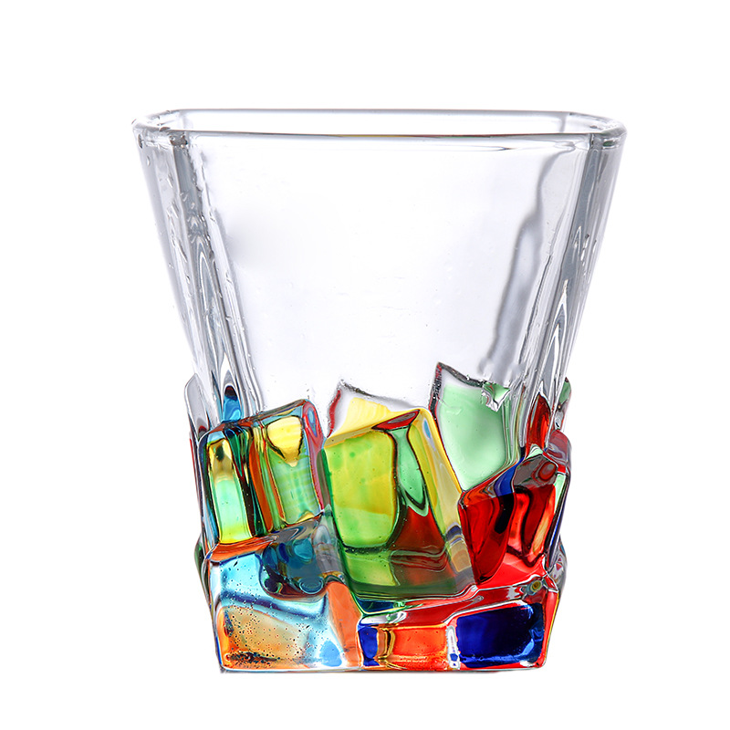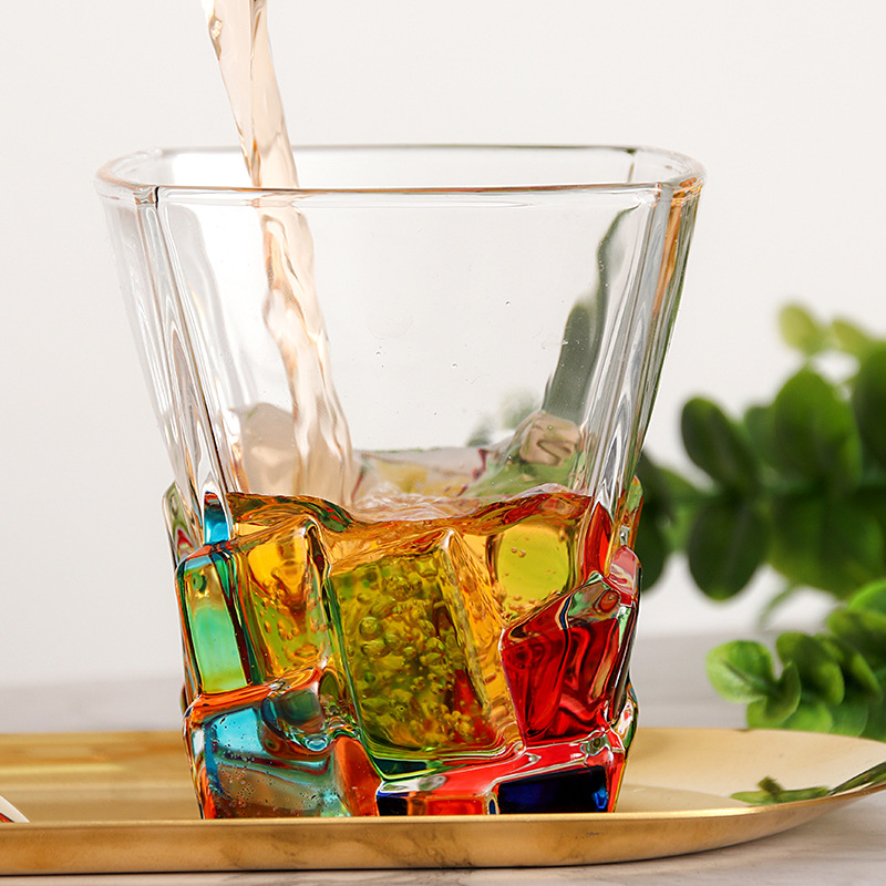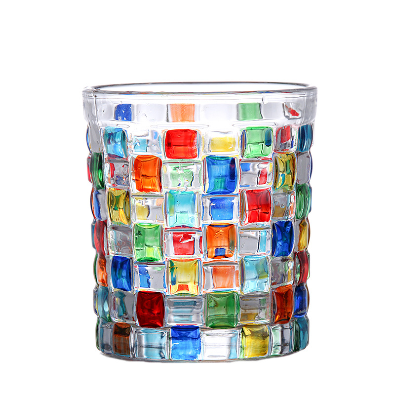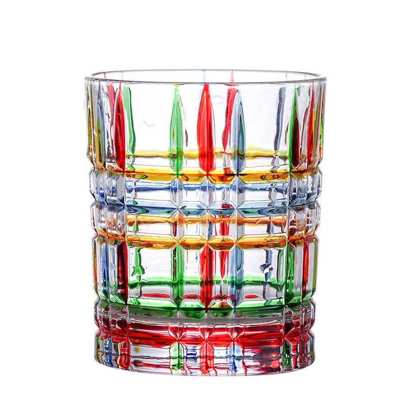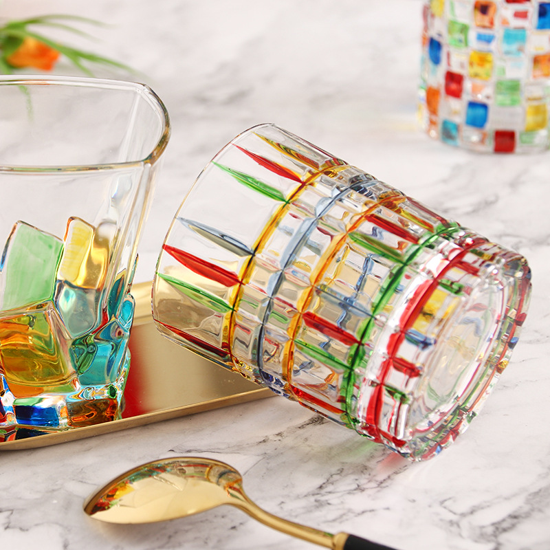 彩色玻璃杯北欧时尚手绘图案加厚玻璃水杯编织批发威士忌洋酒杯