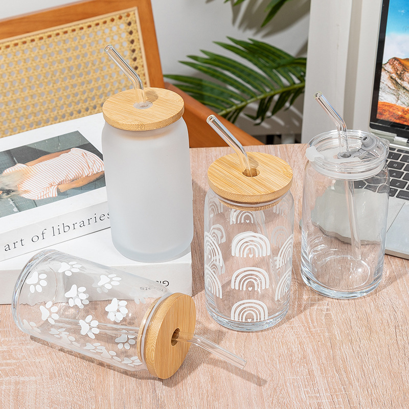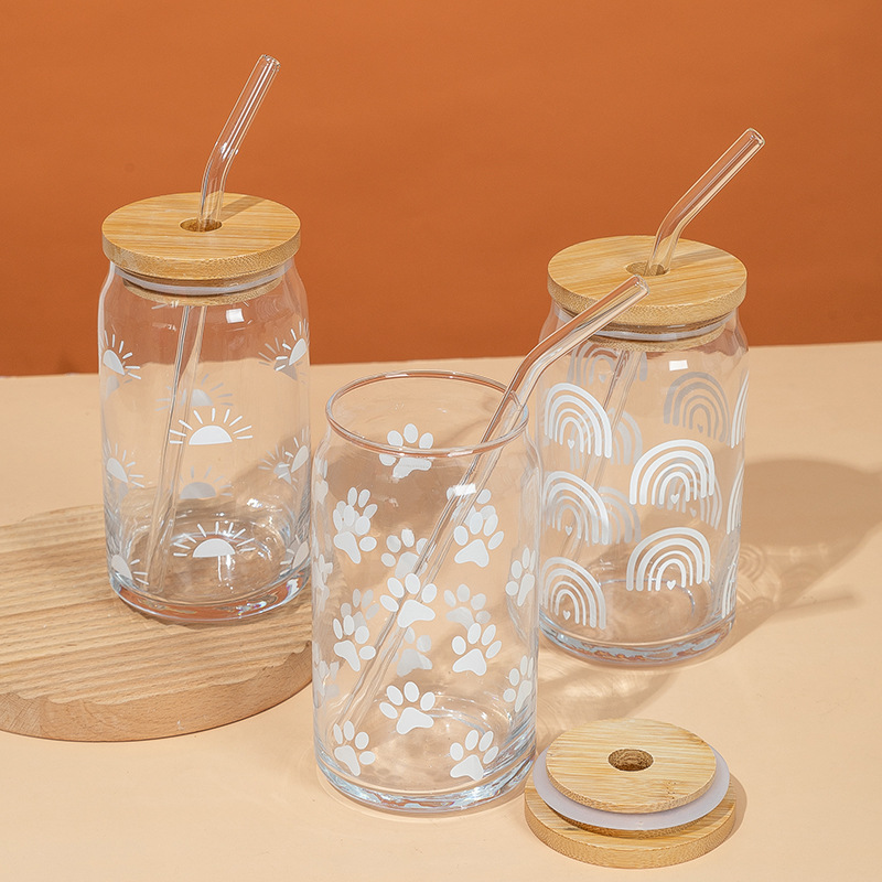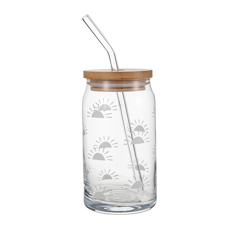 新款加厚印花玻璃杯竹木盖大容量可乐罐吸管杯厨房冷饮喝水杯