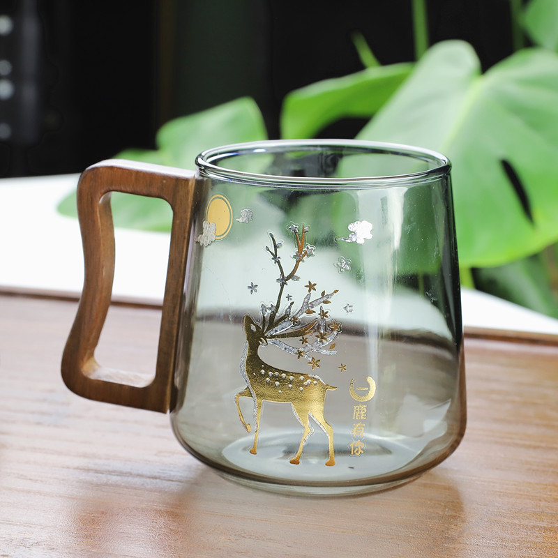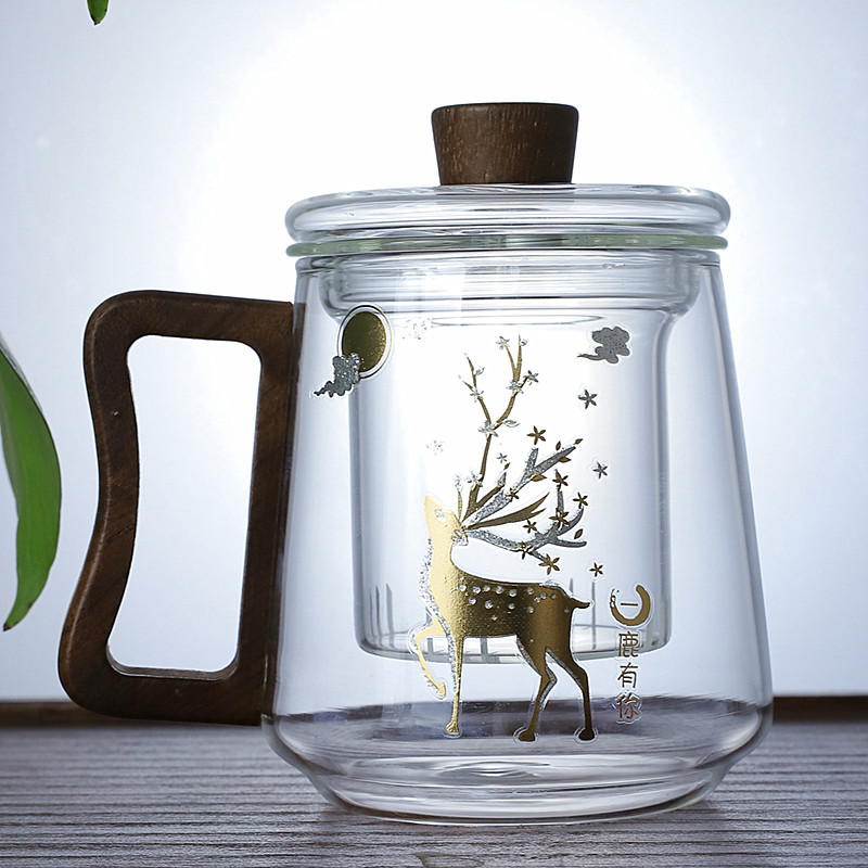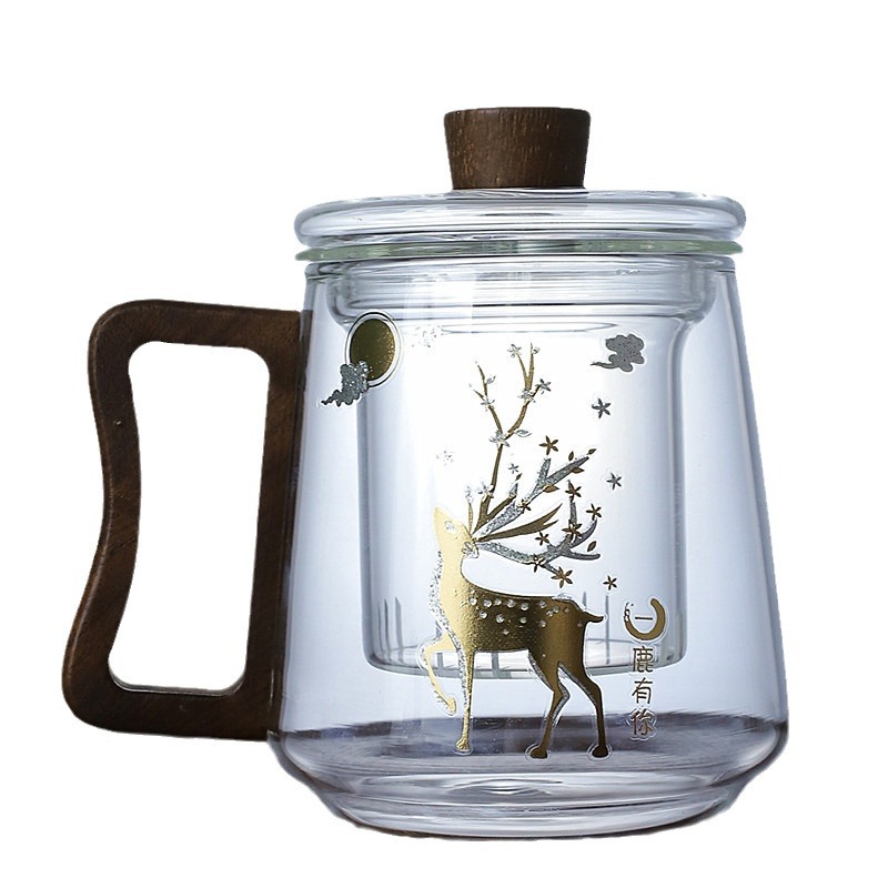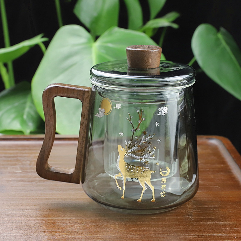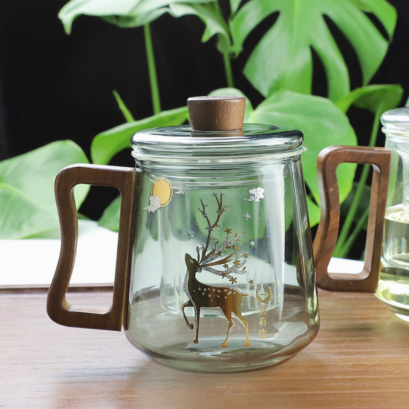 木把玻璃茶水分离泡茶杯个人用办公室茶杯一鹿有你玻璃三件杯