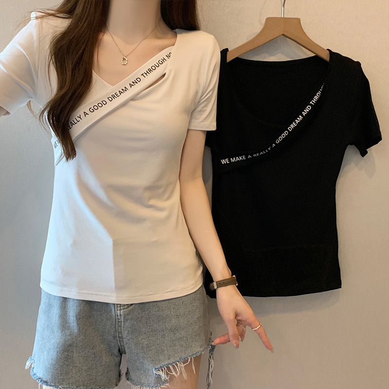 欧货白色正肩t恤女短袖薄款夏季新款低圆领露锁骨心机垫肩上衣潮