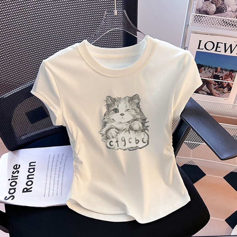 纯棉短袖女设计感小众猫咪印花短袖t恤夏季修身正肩别致漂亮上衣