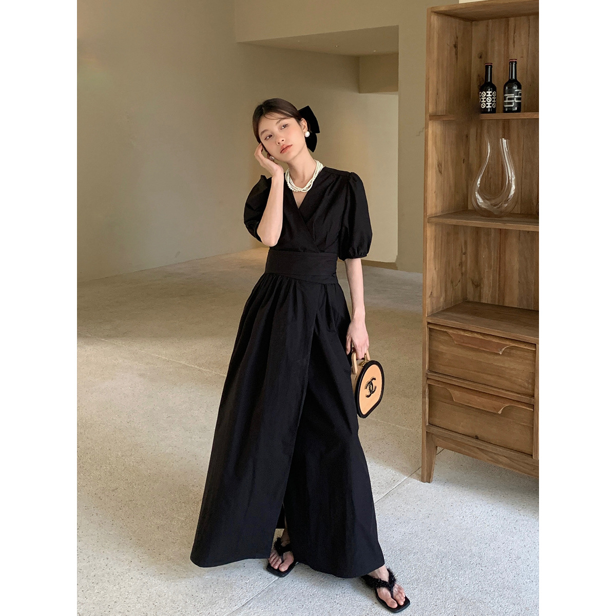 诠释美NEW OPEN网红爆款夏休闲简约连衣裙女气质绑带v领长裙82060