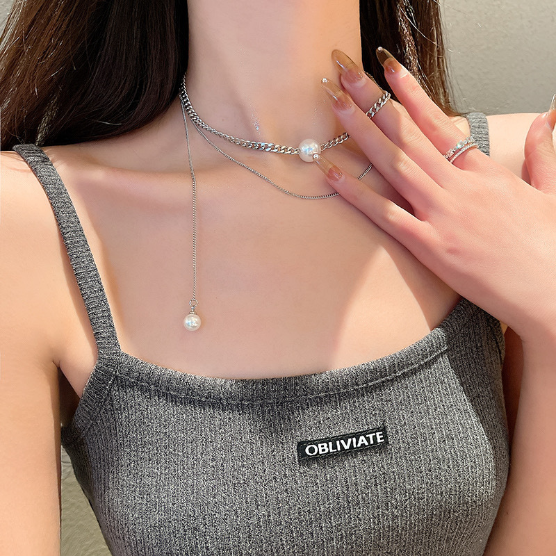 新款小众高级感双层珍珠钛钢项链饰品女百搭气质流苏锁骨毛衣链子