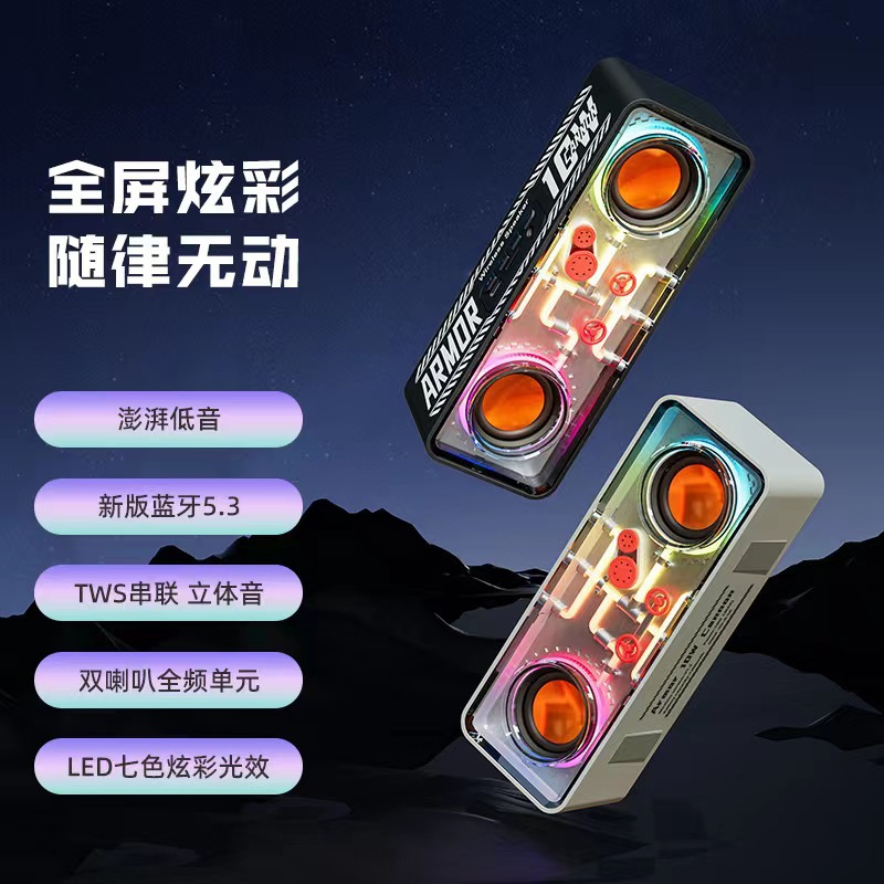 双喇叭透明机甲无线蓝牙音箱赛博朋克风炫彩灯小钢炮低音振膜音响