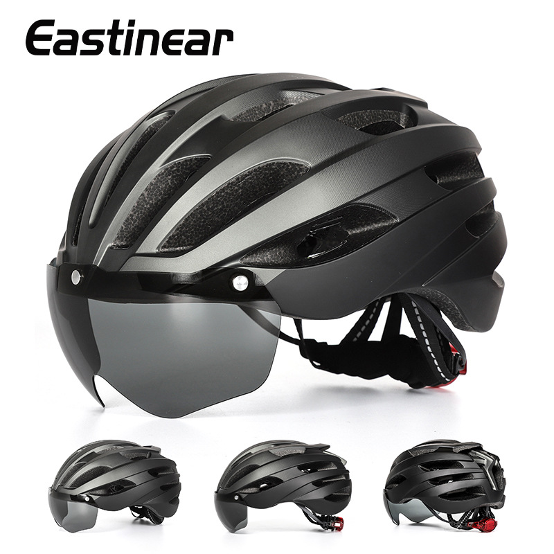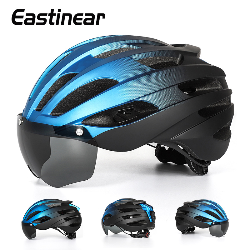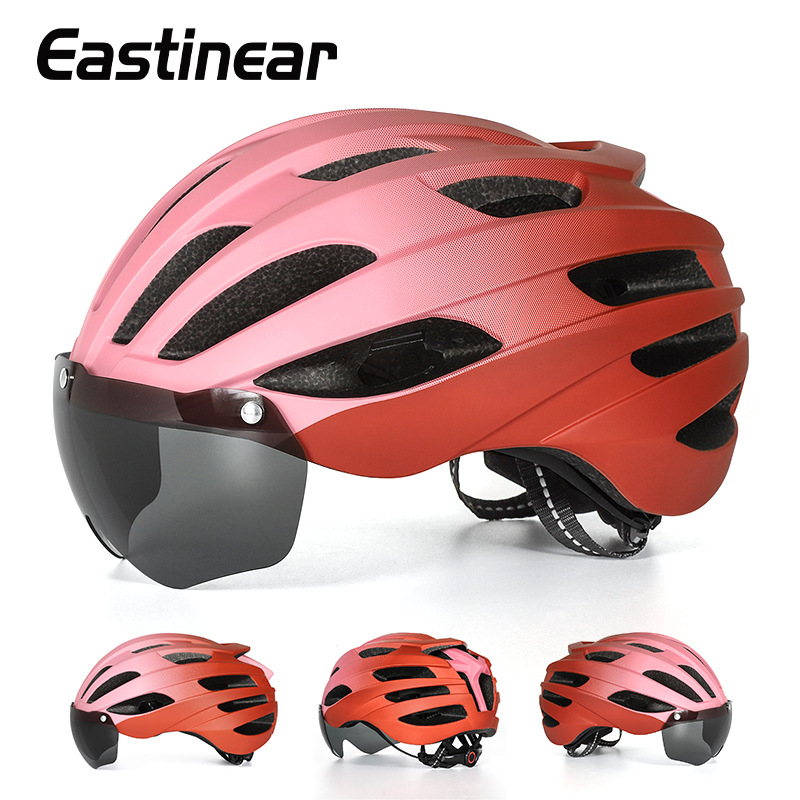 渐变色自行车骑行头盔带风镜一体成型男女公路山地单车头盔