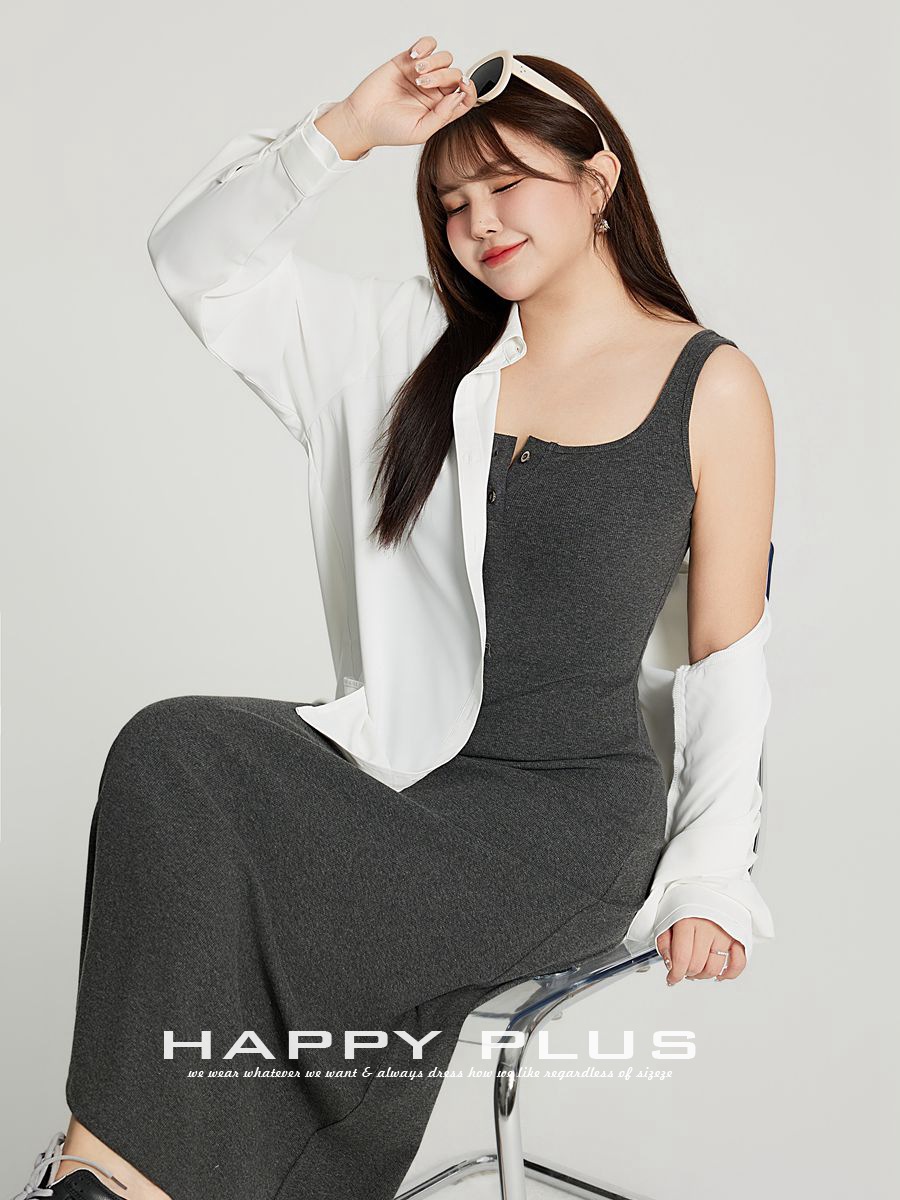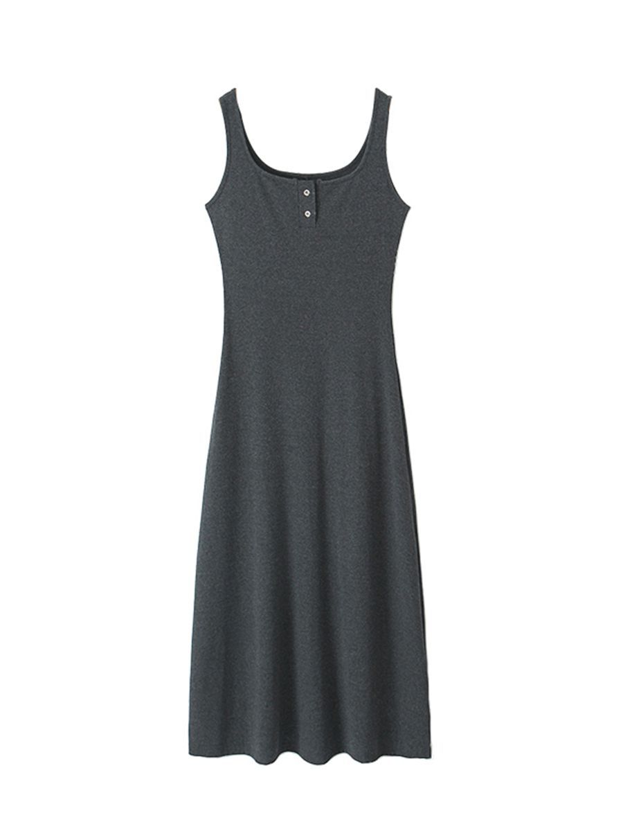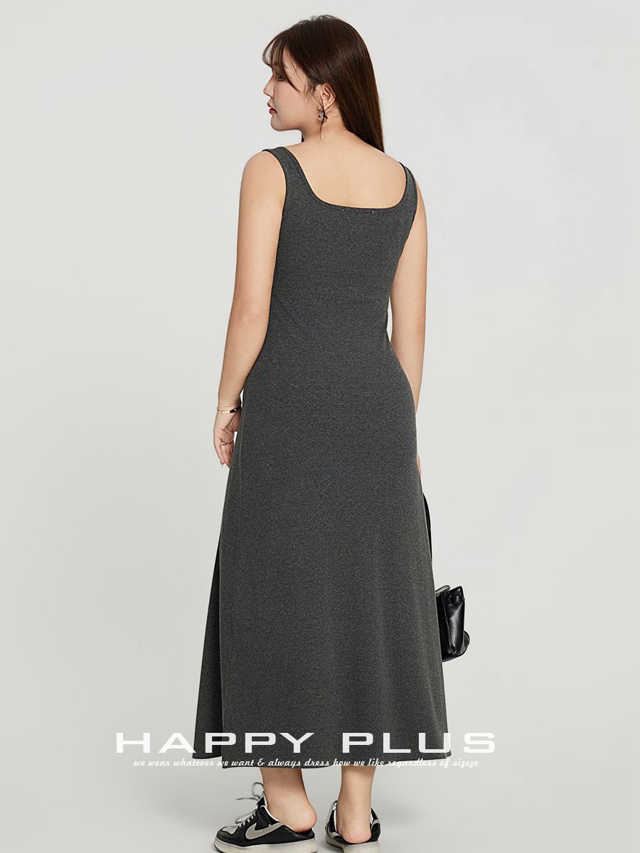 方领纽扣收腰针织吊带长裙润其8870大码女新款法式长款背心连衣裙