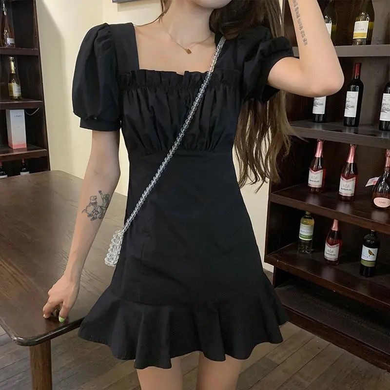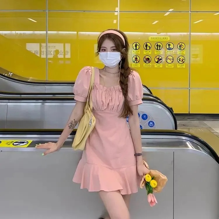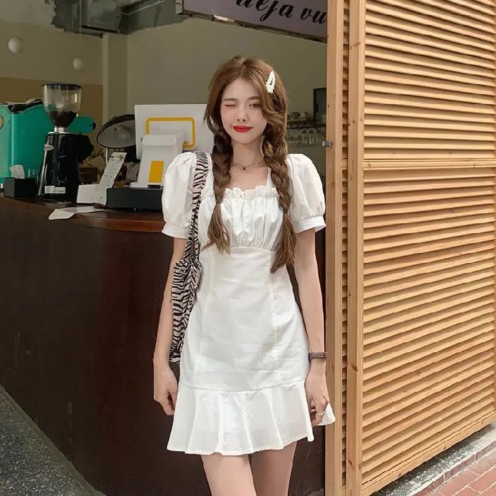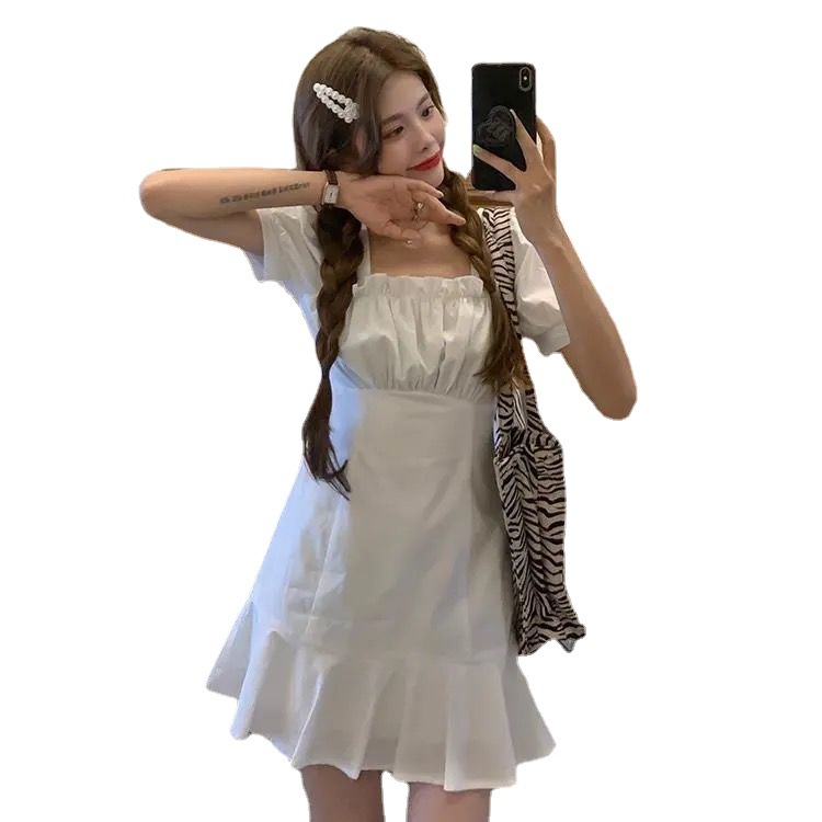 甜辣妹泡泡袖白色连衣裙女夏季新款法式初恋小个子气质短裙子