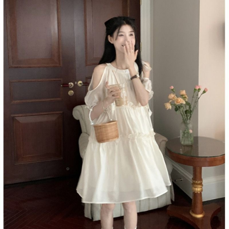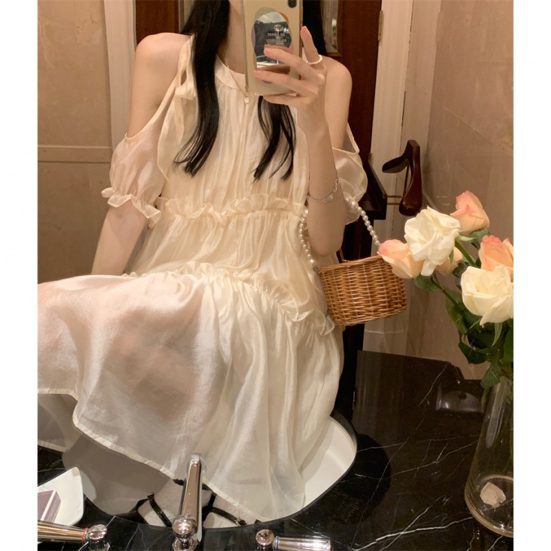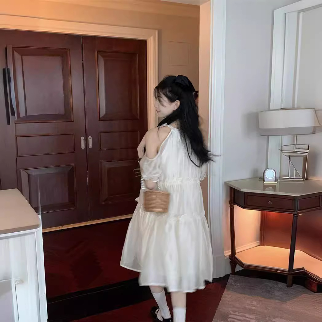 纯欲风露肩绑带圆领连衣裙女新款夏季温柔系气质甜美初恋裙子