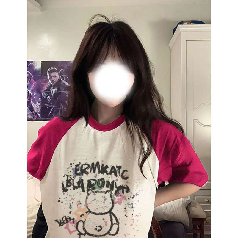 高级感美式纯棉大码短袖t恤女夏季宽松显瘦胖妹妹mm半袖拼色上衣