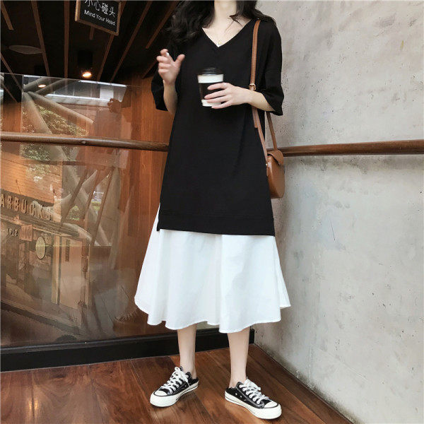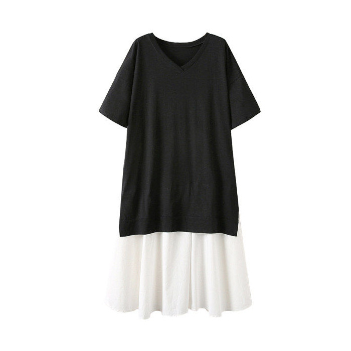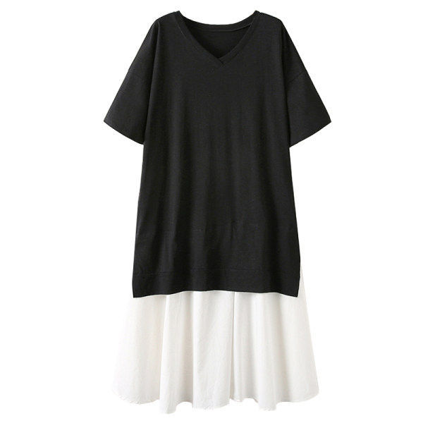 大码假两件连衣裙女装胖mm夏装韩版拼接宽松显瘦遮肚藏肉长裙减龄