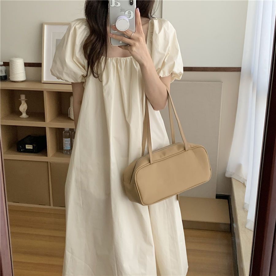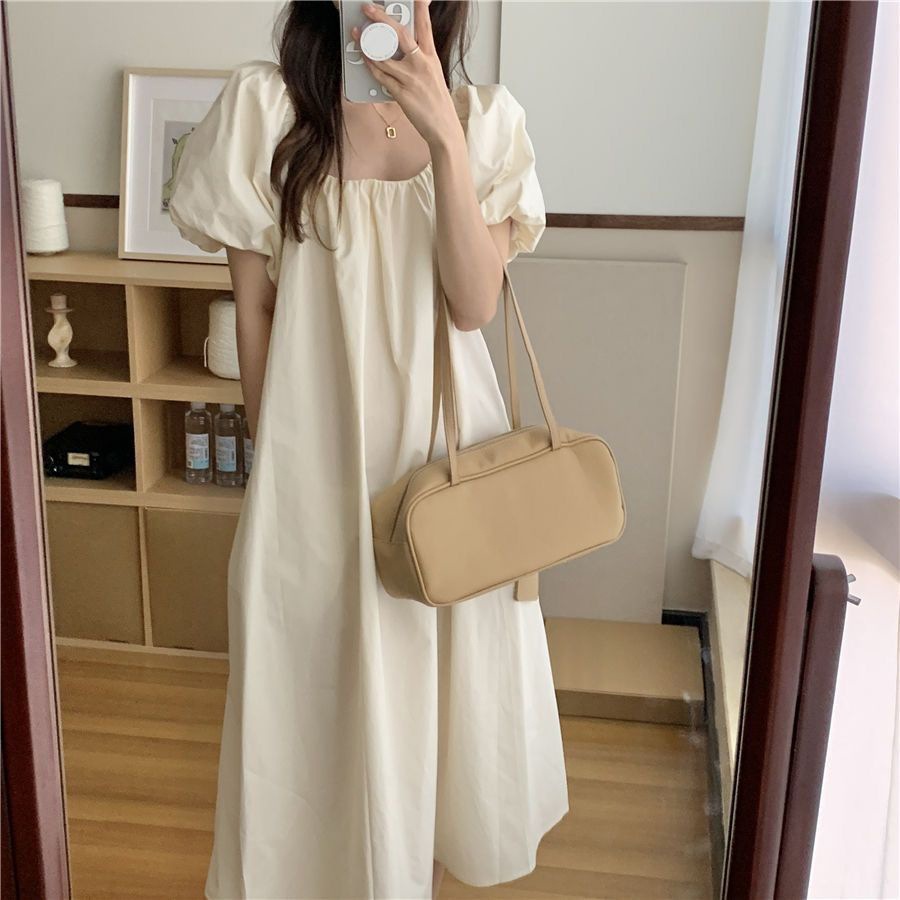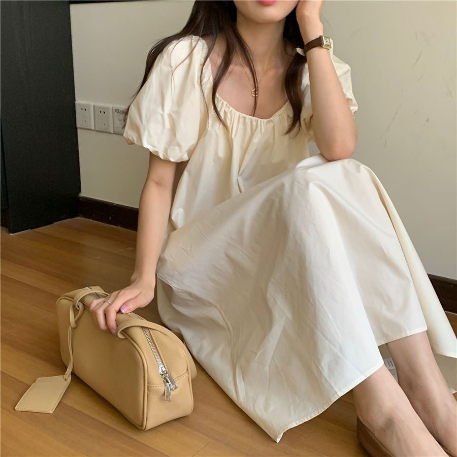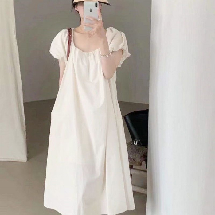 有内里高级感泡泡袖女夏天甜美纯色学生短袖网红显瘦连衣裙外穿女