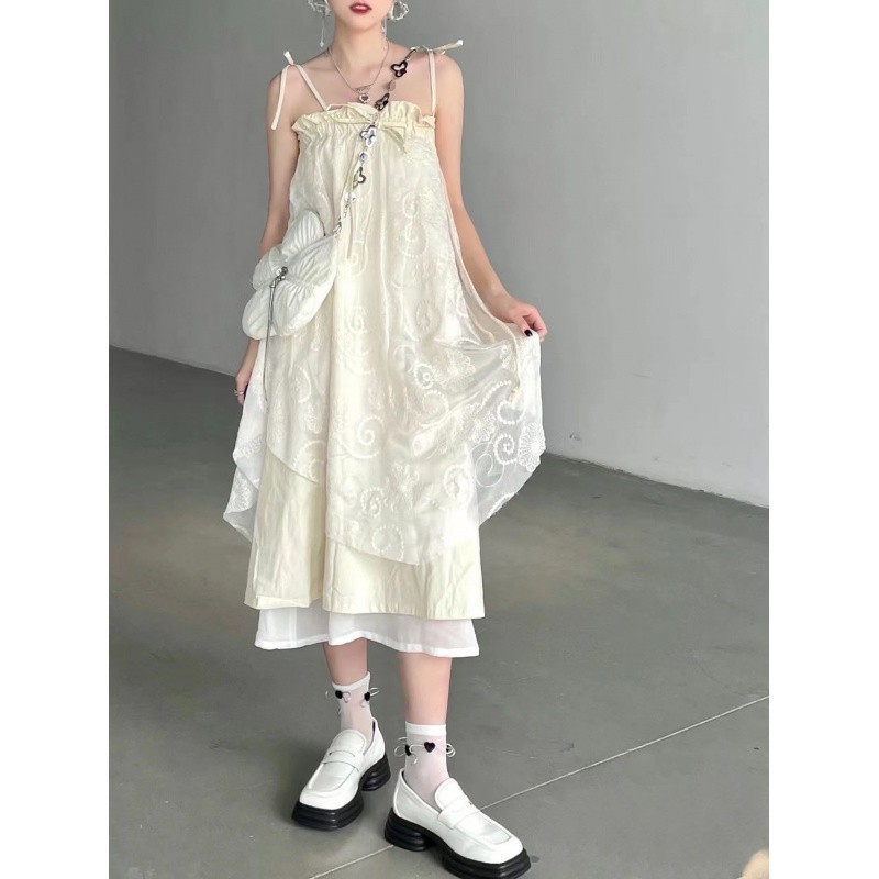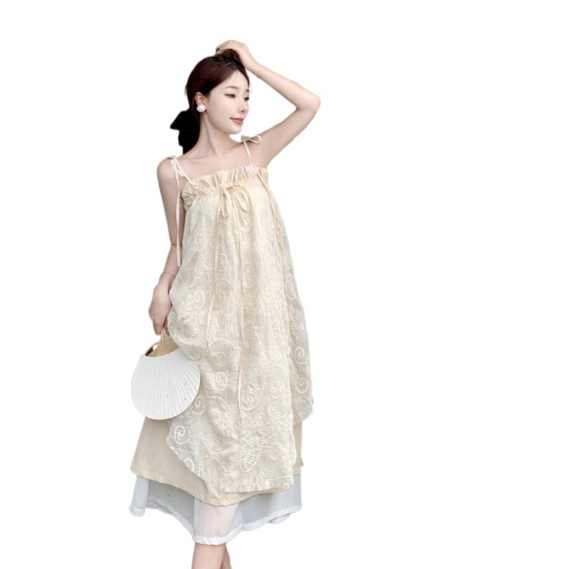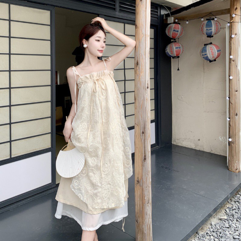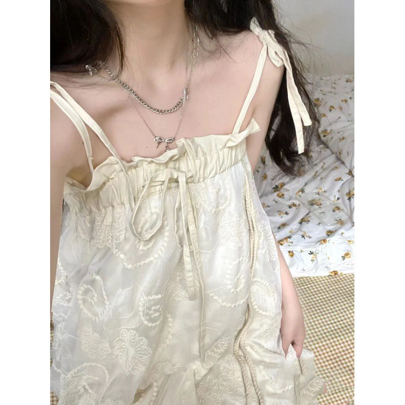法式复古高级感不规则层次感棉麻抽绳重工绑带甜美吊带连衣裙半威