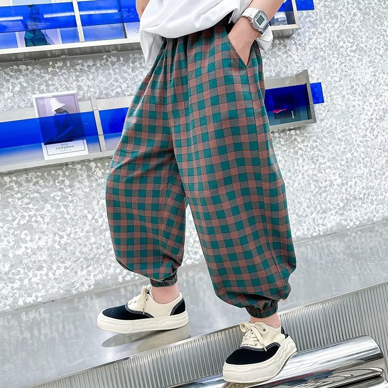 外贸童装夏季休闲格子卫裤男女童宽松束脚九分长裤学生防蚊裤子潮
