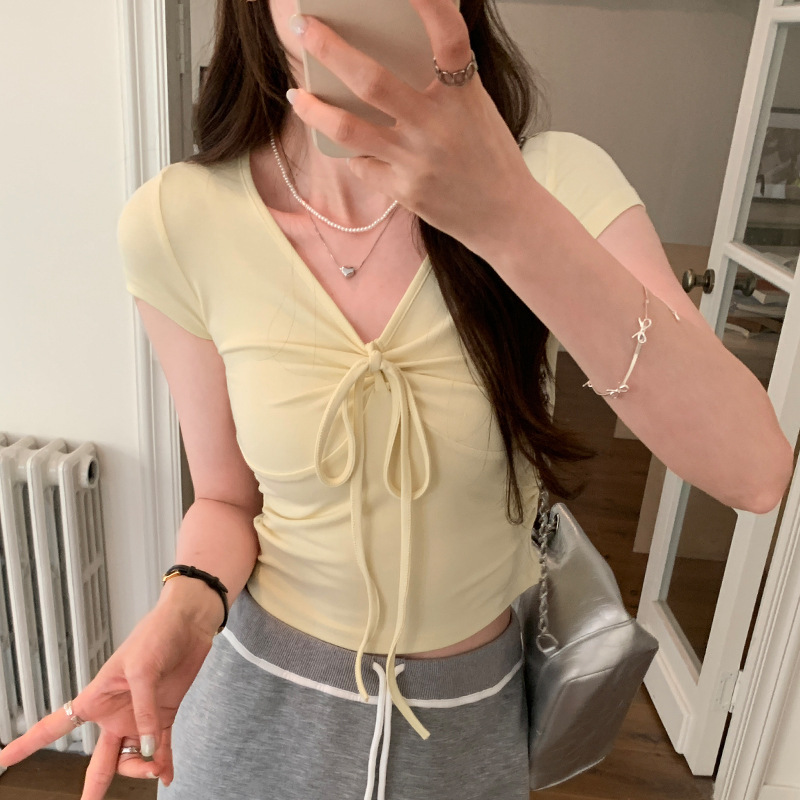 v领套头正肩短袖T恤女夏季新款小众修身显瘦甜辣短款洋气卡腰上衣