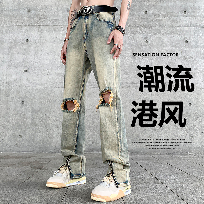 破洞牛仔裤潮破宽松直筒夏季薄款夏天港风潮牌休闲阔腿裤子男款