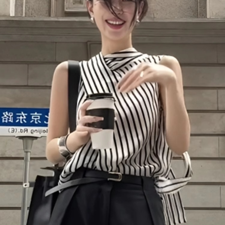 法式轻奢高级感无袖条纹衬衫女夏季新款小众气质飘带宽松显瘦上衣