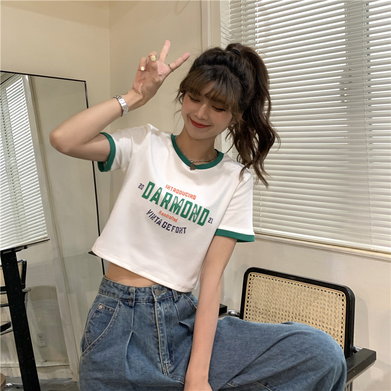 纯棉夏季短袖t恤女新款韩版高腰显瘦半袖港风露脐短款上衣