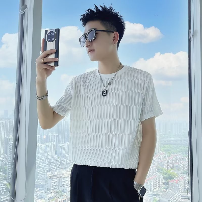 刺绣七分袖男t恤夏季潮牌潮流宽松大码半袖圆领体恤衫短袖上衣服
