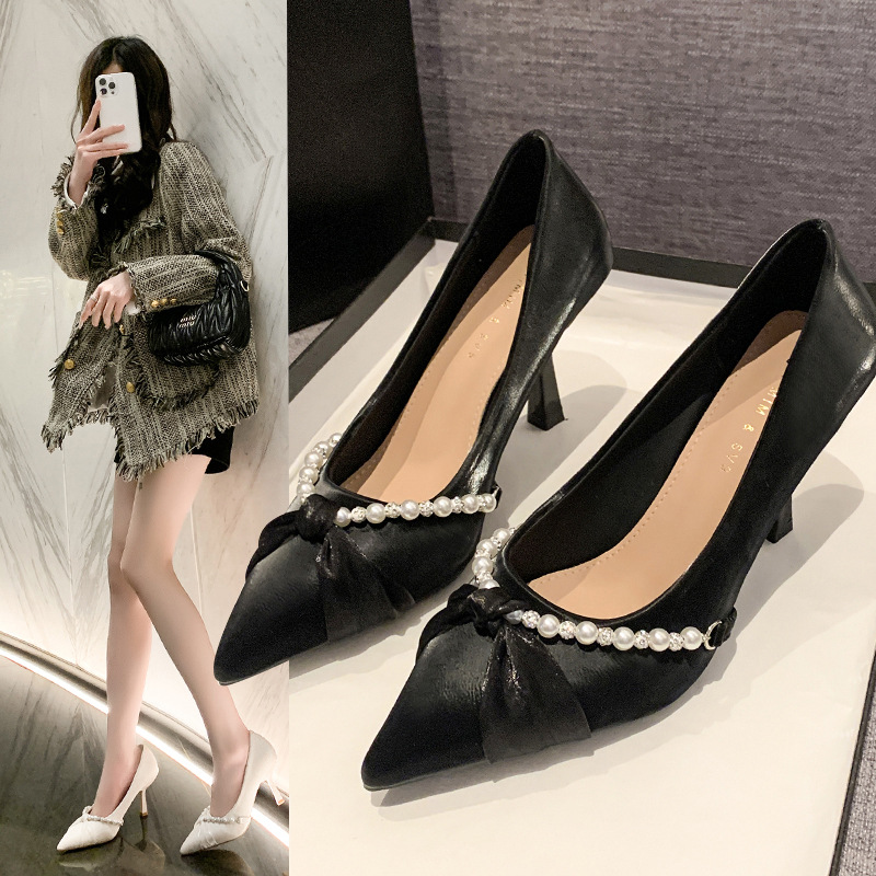 名媛气质绸缎高跟鞋女细跟珍珠扭结侧空单鞋仙女风性感单鞋