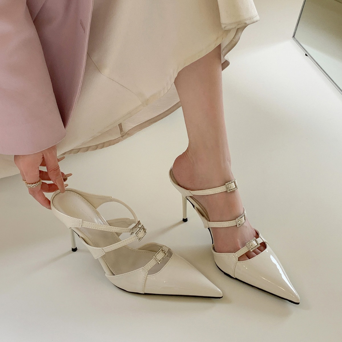 白月光气质尖头高跟半拖鞋女细跟包头一字水钻穆勒鞋