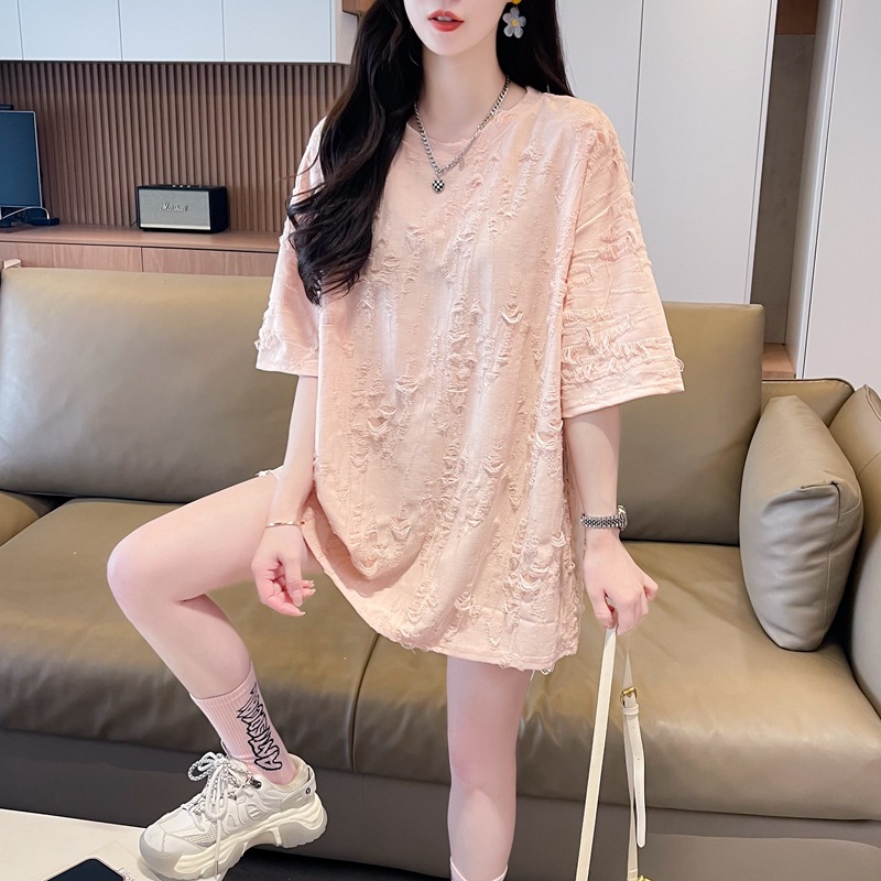 后包领夏季中长款镂空短袖破洞T恤女2025新款洋气时髦上衣