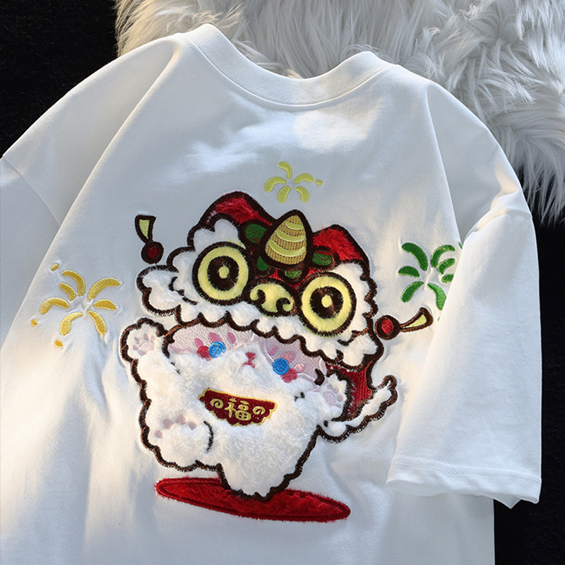 国潮植绒毛巾绣舞狮短袖T恤男女小众设计感bf慵懒风情侣半袖上衣