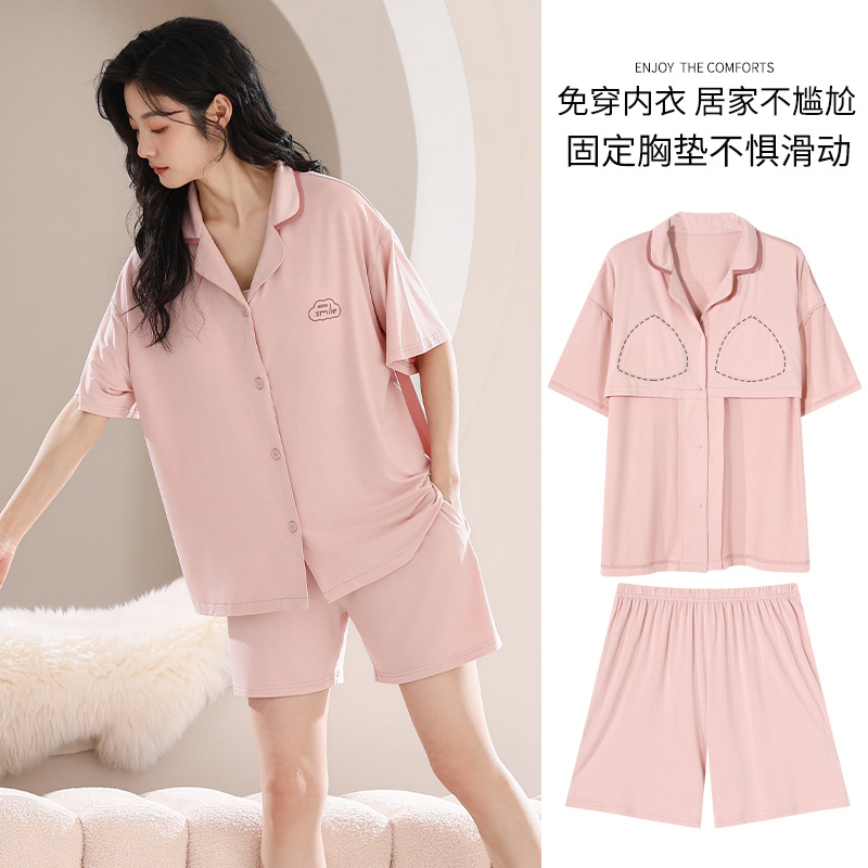 带胸垫睡衣女夏季短袖短裤莫代尔薄款可外穿防凸点开衫家居服夏天