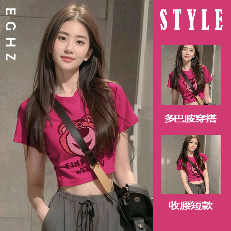 法式甜辣风多巴胺短袖t恤女设计感小众别致玫红色辣妹bm纯棉上衣