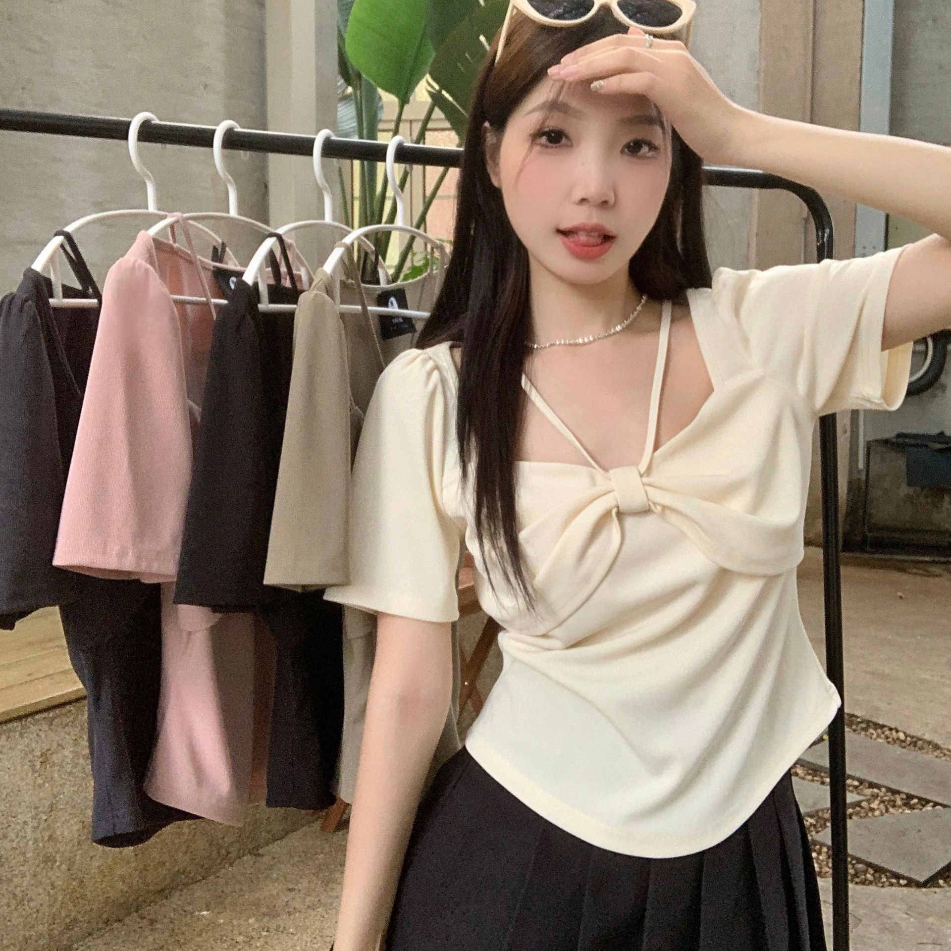 短袖t恤女装设计感小众夏季微胖m辣妹锁骨正肩显瘦短款上衣潮