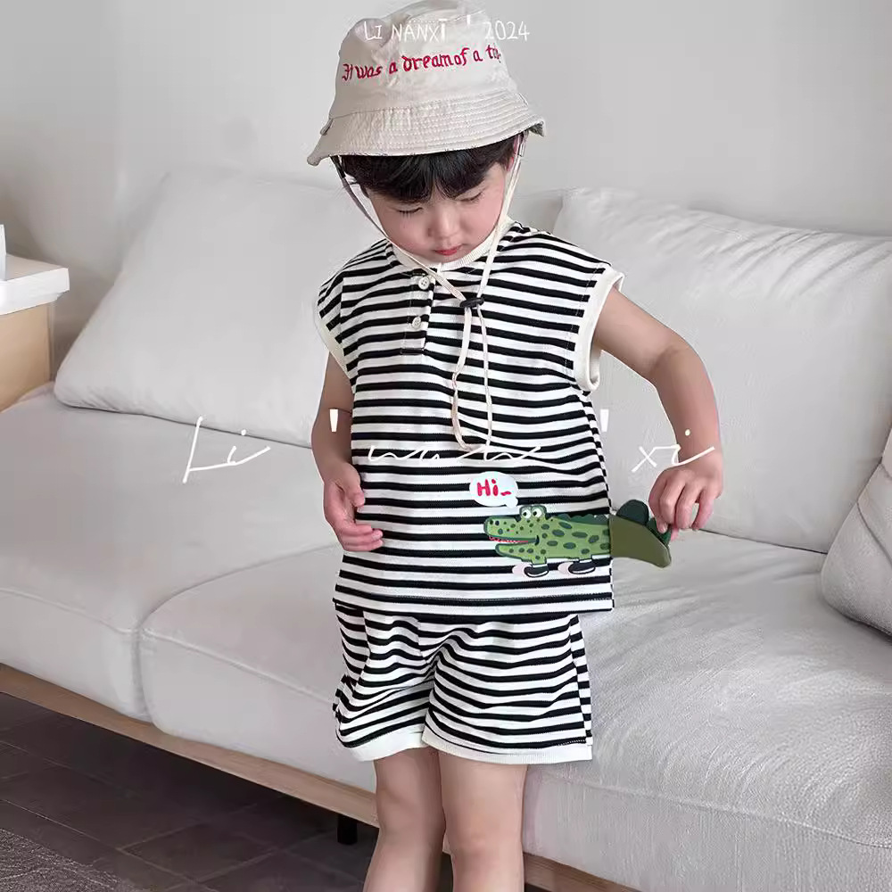 50012夏季新款24年儿童套装韩版童装条纹针织无袖卡通短裤两件套