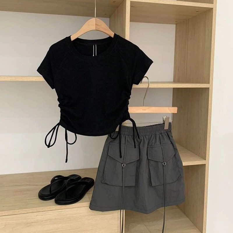 夏季女童套装宝宝网红洋气儿童个性潮时髦炸街抽绳T恤口袋短裙裤