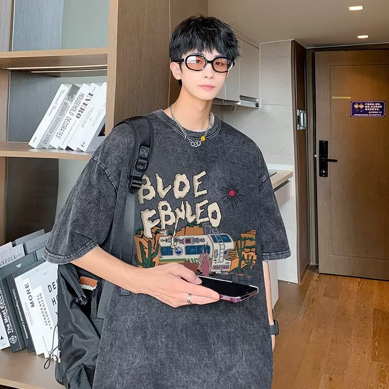 美式复古重磅水洗做旧100%短袖t恤男新款设计感情侣潮牌上衣